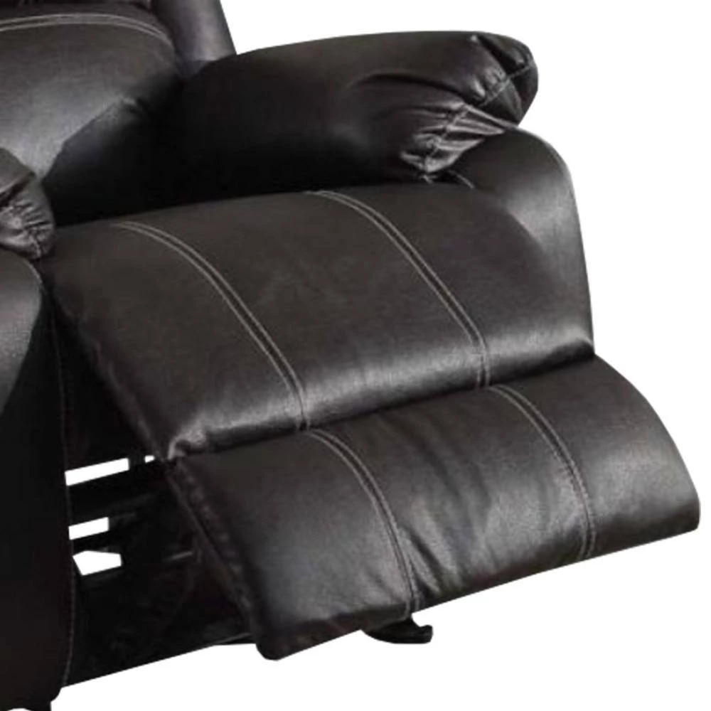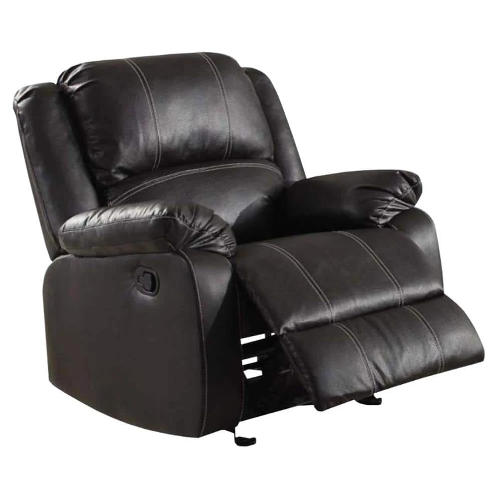 Bring home the feel of the cinemas with this contemporary style rocker recliner seat. Keep your favorite movies ready and sink back into the dreamy cushioning of this black recliner. Bearing an Leatherette upholstery, this recliner sports a metal framework which makes it a sturdy piece of furniture. Other items in the image are sold separately.