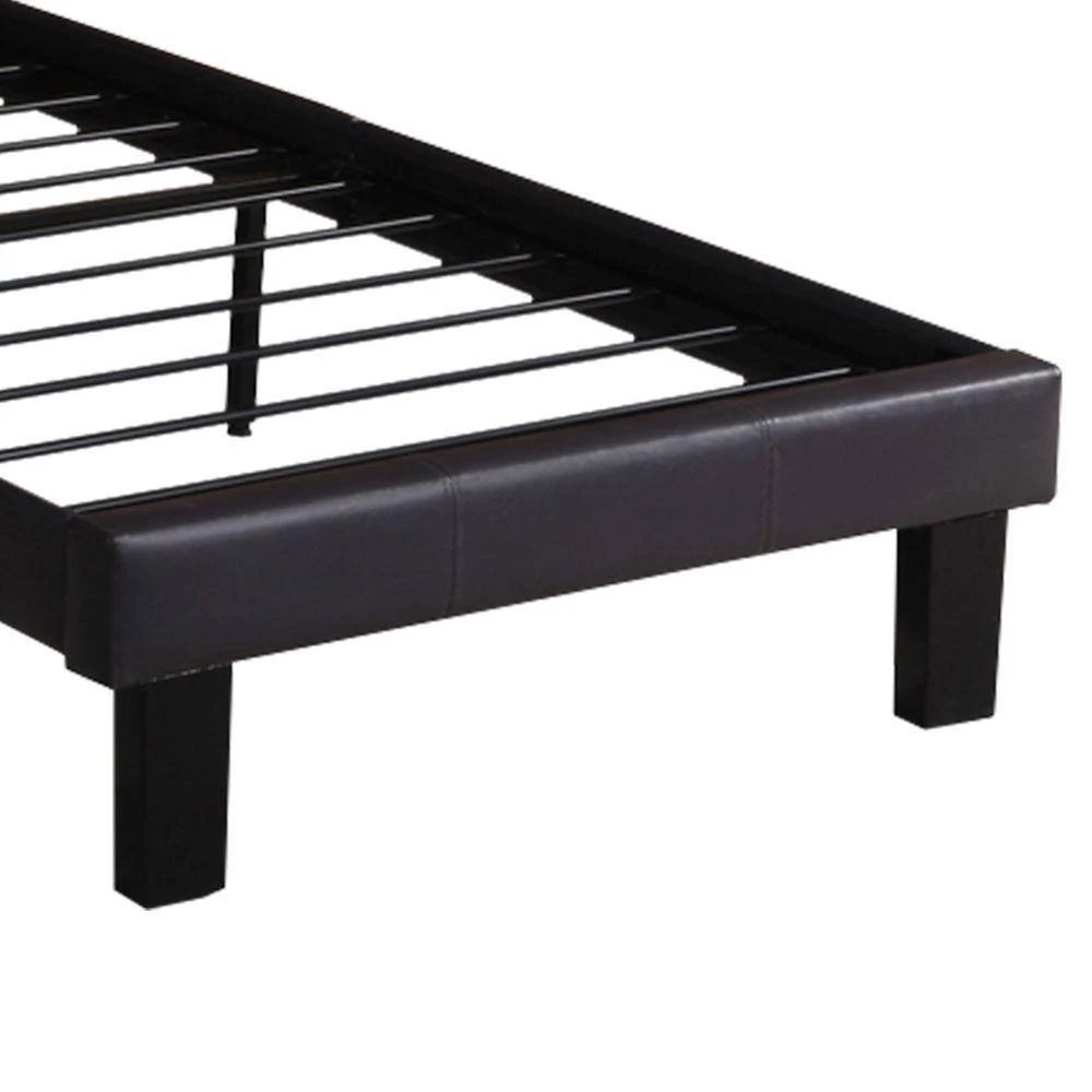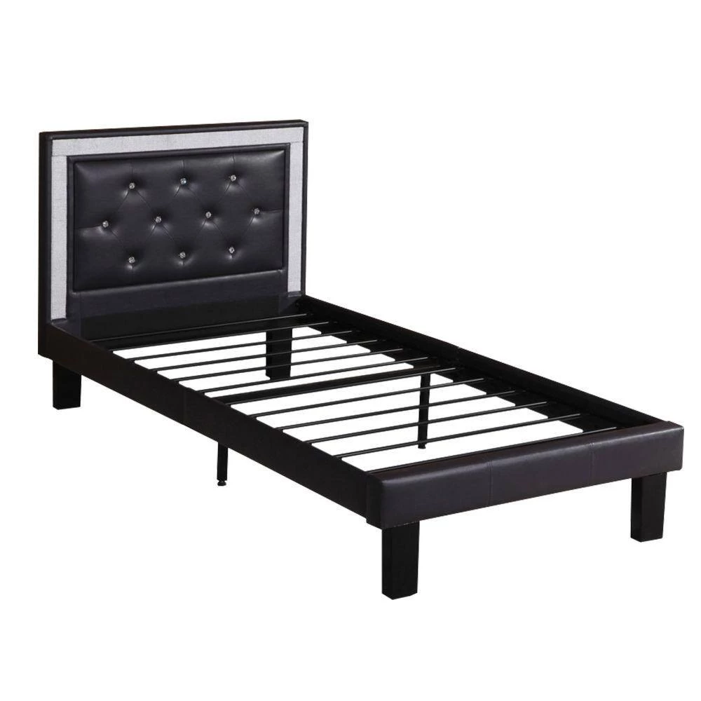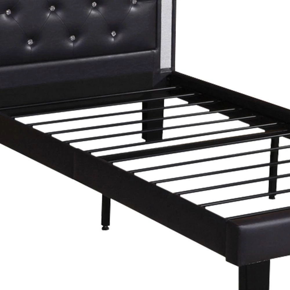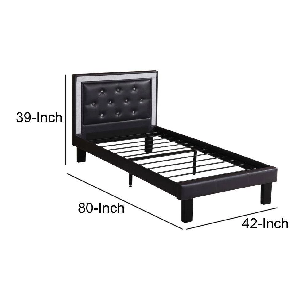 This twin size bed with high button tufted headboard is perfect to incorporate any bedroom furniture setting. The construction of this bed involve the use of plywood panel that is being used to make a solid pine frame, it also have solid pine side rails supported with wooden legs, and its rectangular headboard draped in black color leather with tufted bottoms and white highlighted border is the key feature of this bed. It will enhance the beauty of your space.