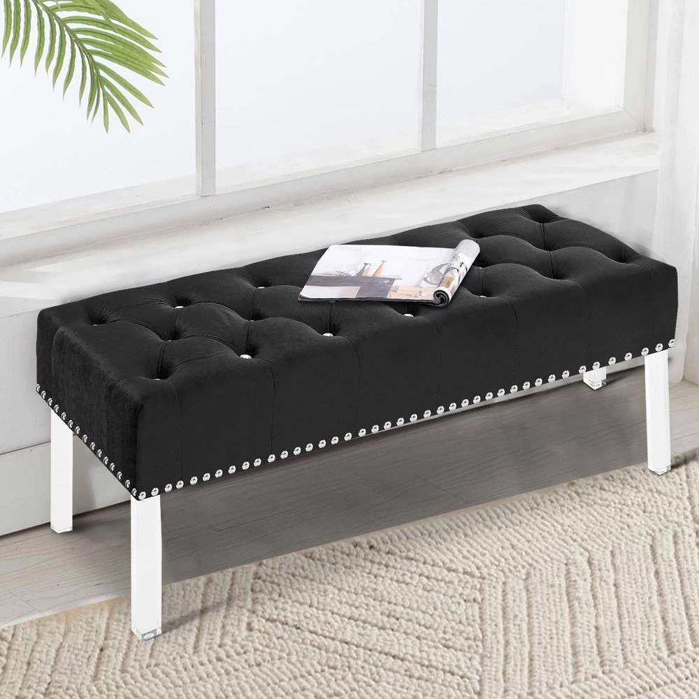 Give your interior a modern makeover by introducing this exquisitely crafted bench from the Bernard collection to your home. Featuring a wide rectangular seat with crystal tufted details. It is crafted from a clear acrylic frame and is upholstered with gorgeous black velvet fabric.
