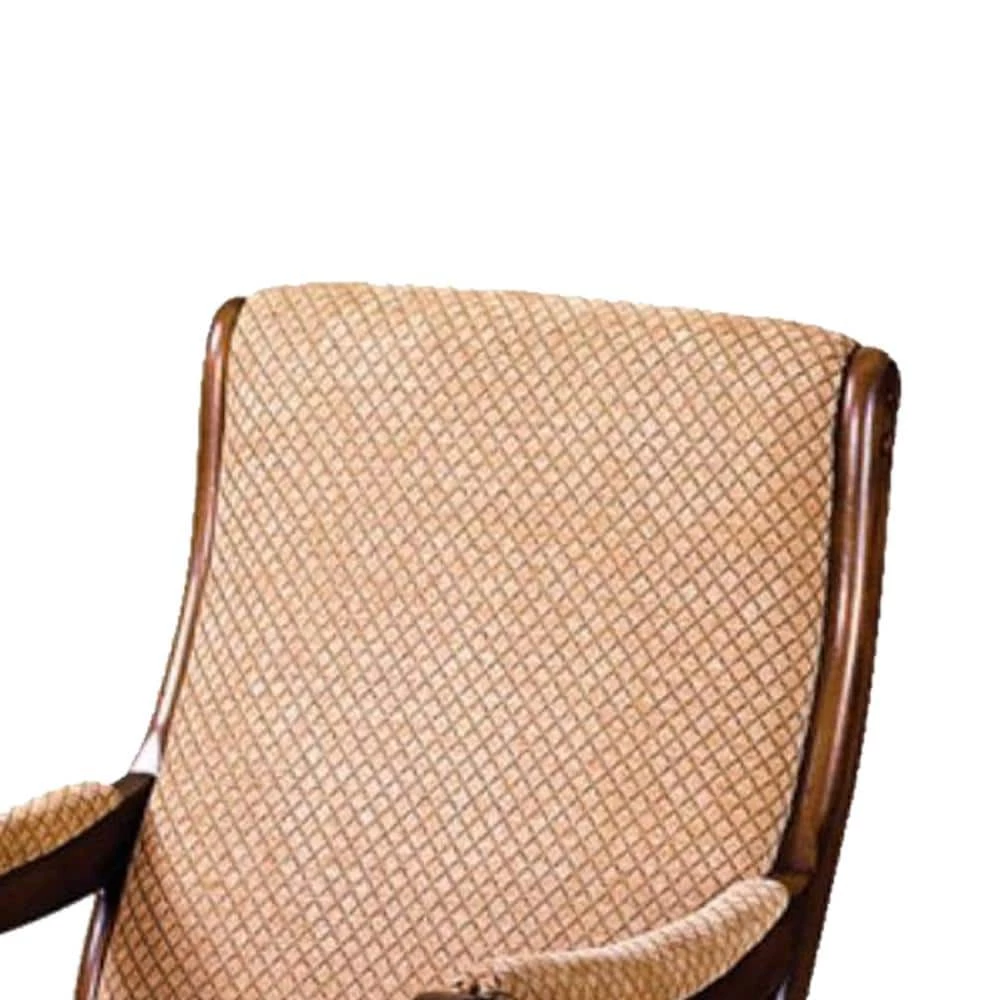 Get comfort and relaxation after long tiring day on this beautiful rocking chair. Constructed from solid wood in a brown finish, it features a fabric upholstered seat and backrest in the hue of beige, incorporating padded armrests for comfort. It is supported by stretchers that extend to form a rocking base.