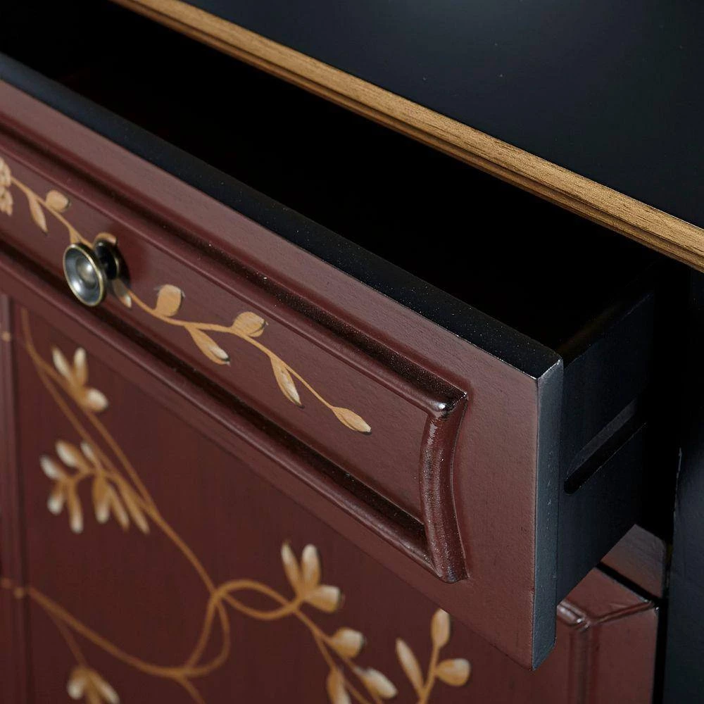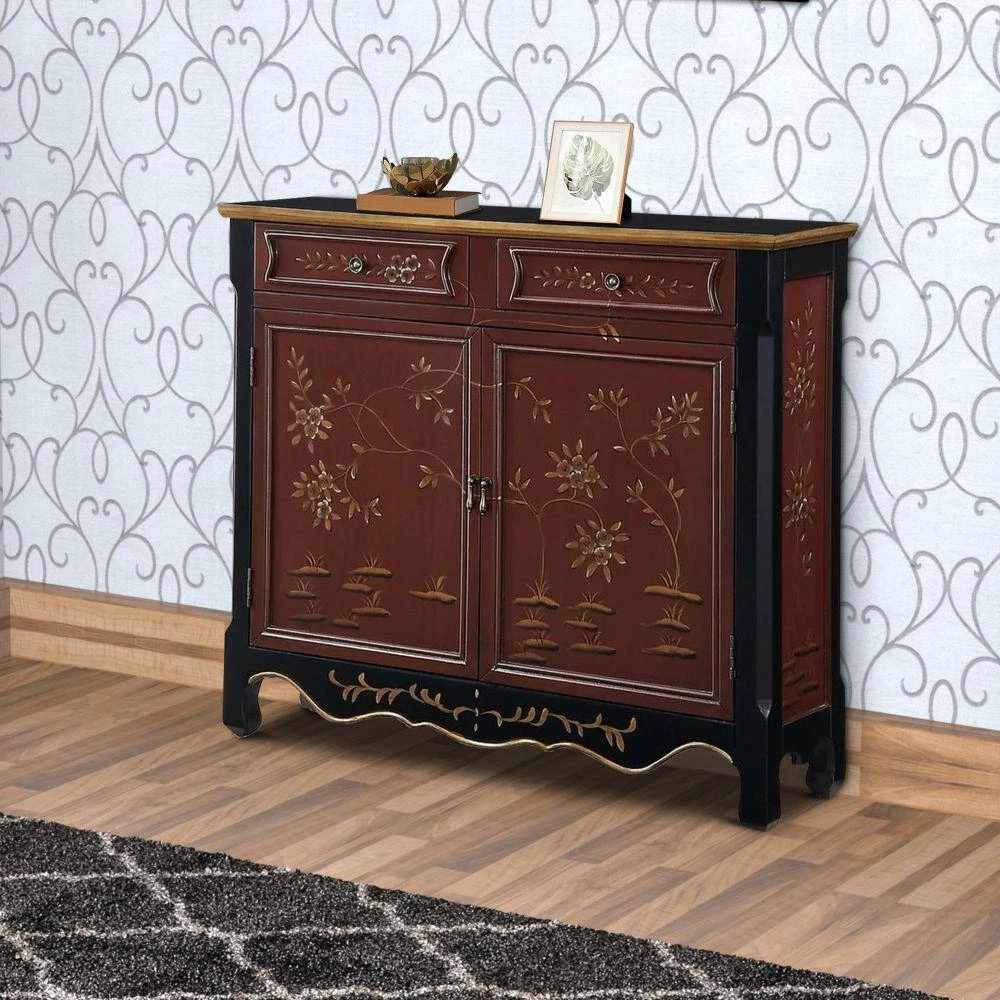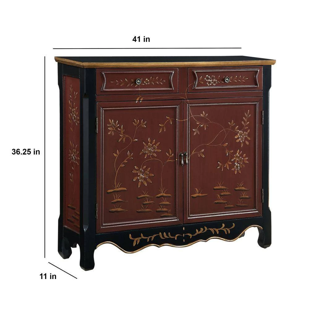 Amalgamate your existing decor setting by bringing in this transitional style-inspired Storage Cabinet, which showcases floral engraved details. Incorporated with 2 smooth-gliding drawers and 2 door storage, it is constructed from the combination of solid wood and mdf. It is Strong and sturdy. Accented in the hues of brown and black.