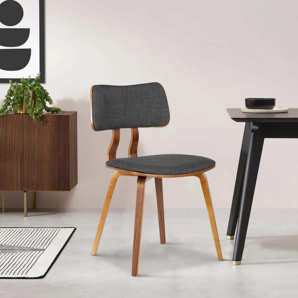 Give a quick changeover to your dining space with this mid century style dining chair. The padded seat and back are upholstered in charcoal fabric, supported over a walnut wooden frame. Emanating elegance, the chair will transform any dining space without much effort.