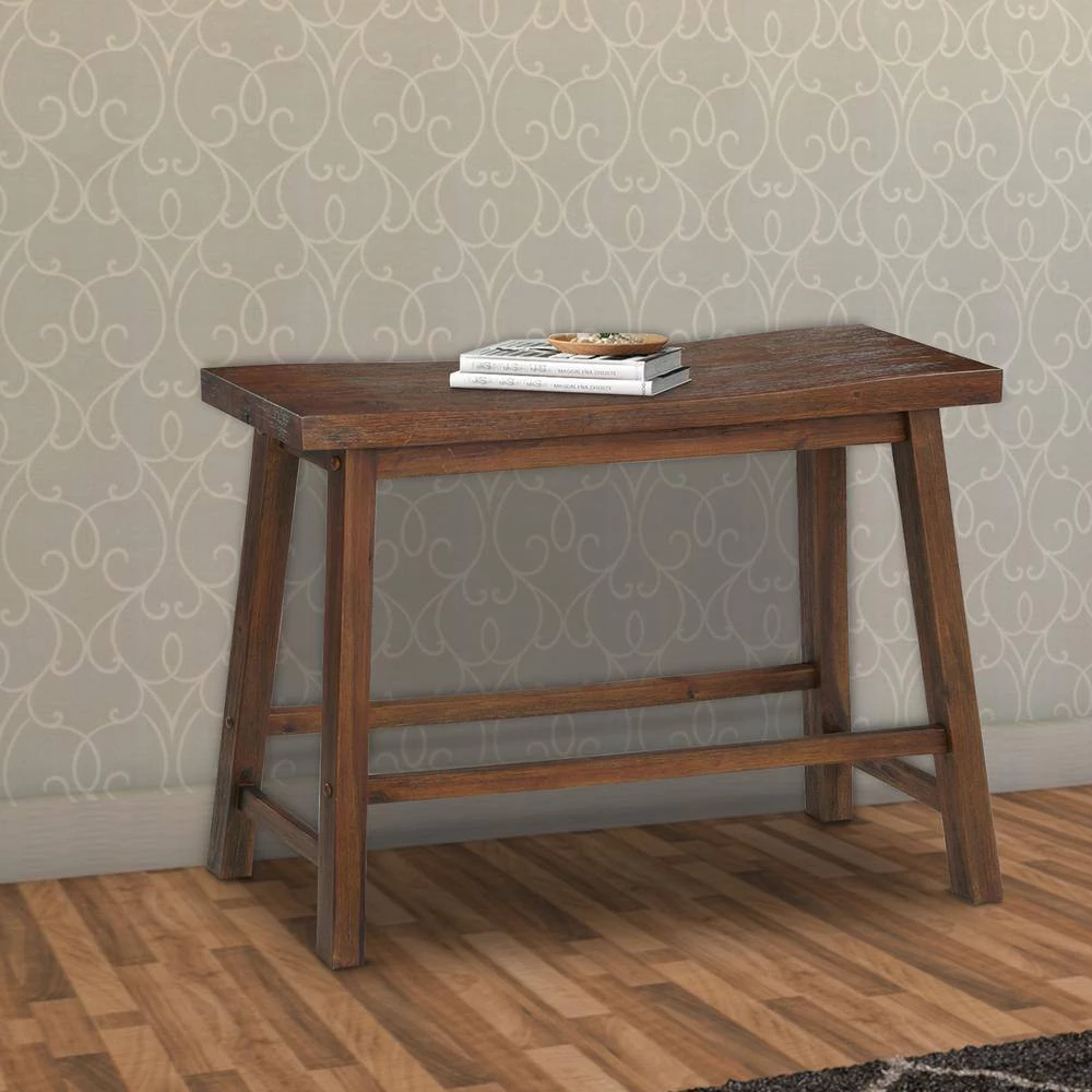 Add a touch of casual sophistication to your home with this bench that fits in both modern and classic decor setting. Built to last with rubberwood construction in a wire brushed finish, featuring a saddle design seat with slanted legs backed up by functional and durability. Ideal for any room in your home, this wooden bench offers additional seating for any occasion.