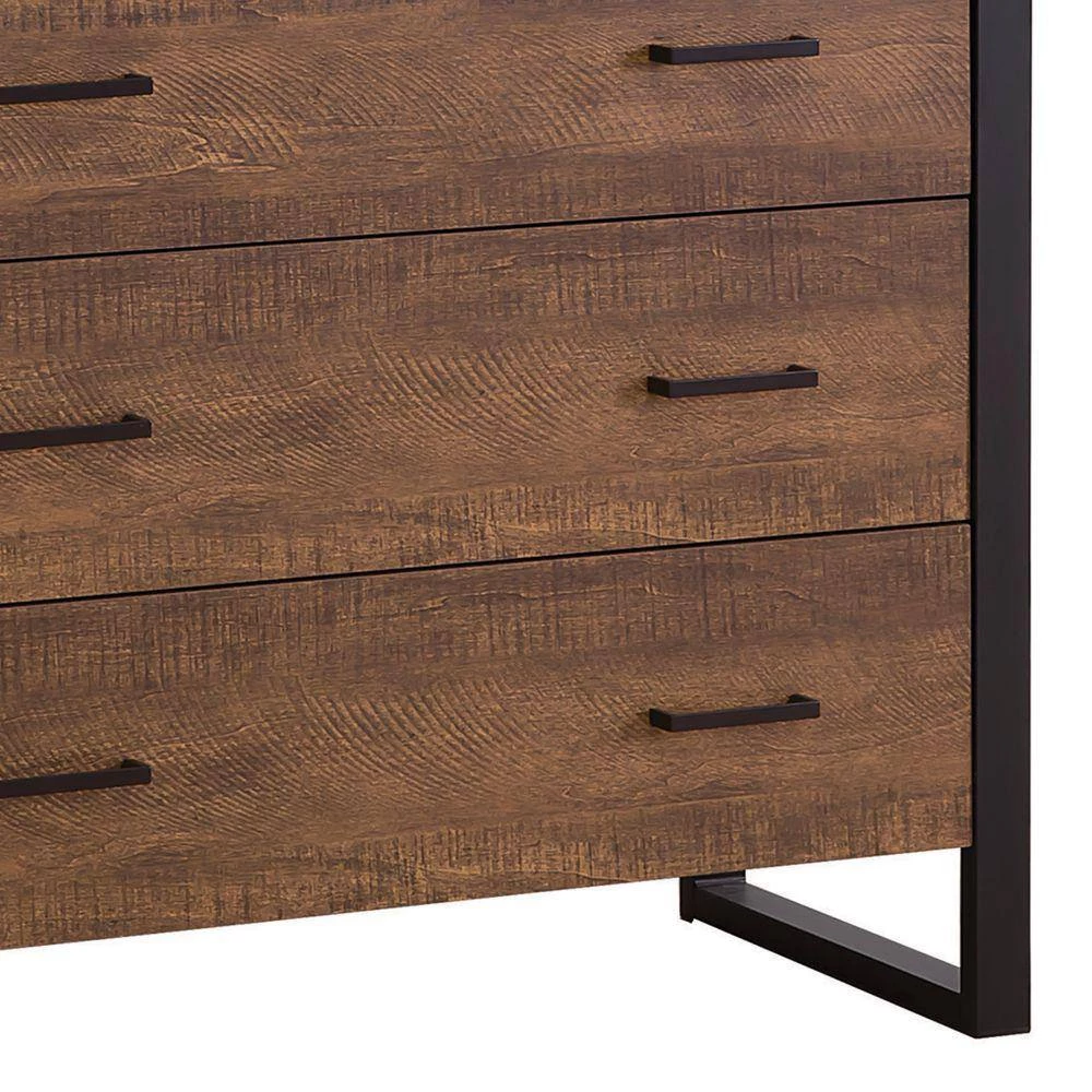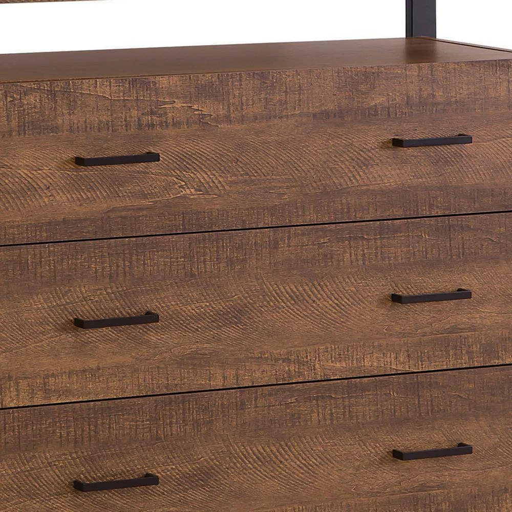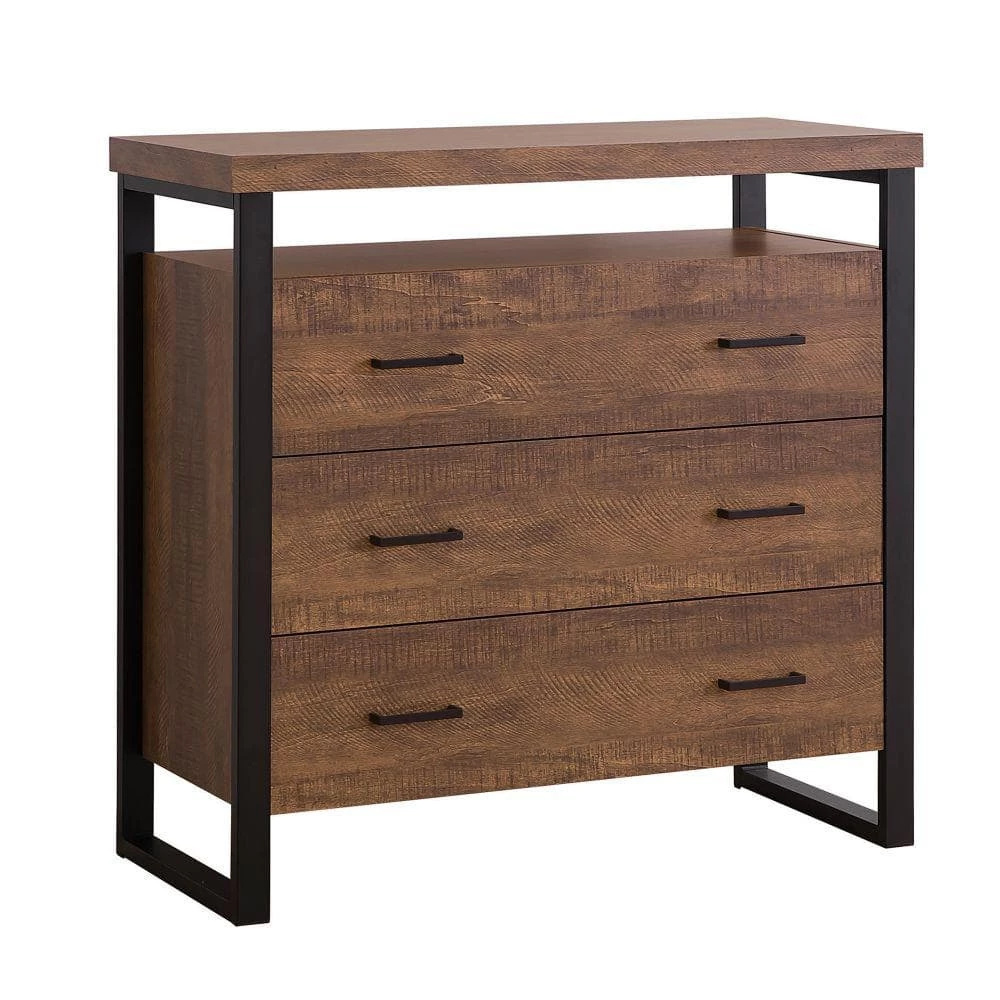 This refined accent cabinet has three drawers with bar hardware. The drawers appear to be floating between the minimalist metal supports framing each side. The drawers and the top of the piece are finished in rustic amber (Brown). This trendy piece would match either rustic or industrial design styles.