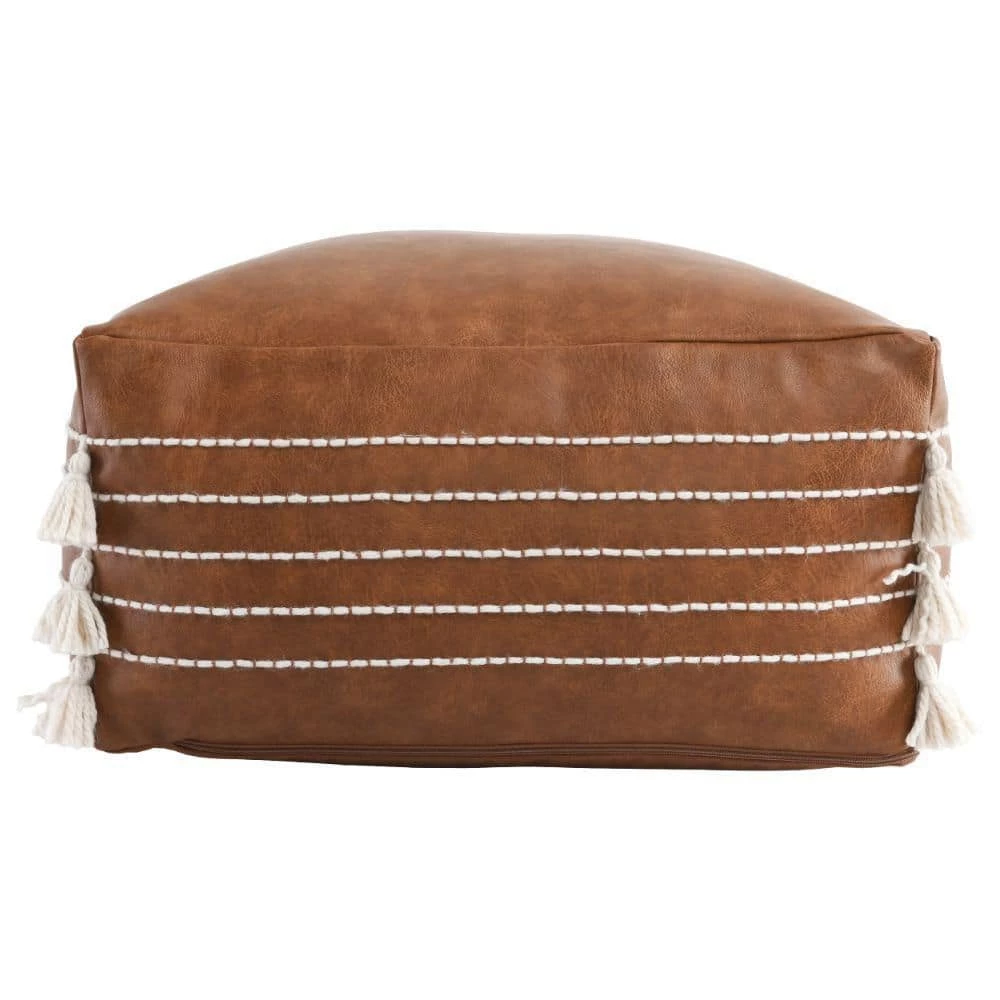 Luxurious and ultra soft, this pouf makes a perfect fit for your lounge, living room, den, or bedroom. Whether used as additional seating or as a footrest while lounging on your comfortable sofa, this pouf depicts artisanal yarn embroidery and tassel accents for an appealing look that looks great all the time. Generously filled with comfortable polystyrene beads, the brown vegan faux leather cover harmonizes with essentially any decor style.