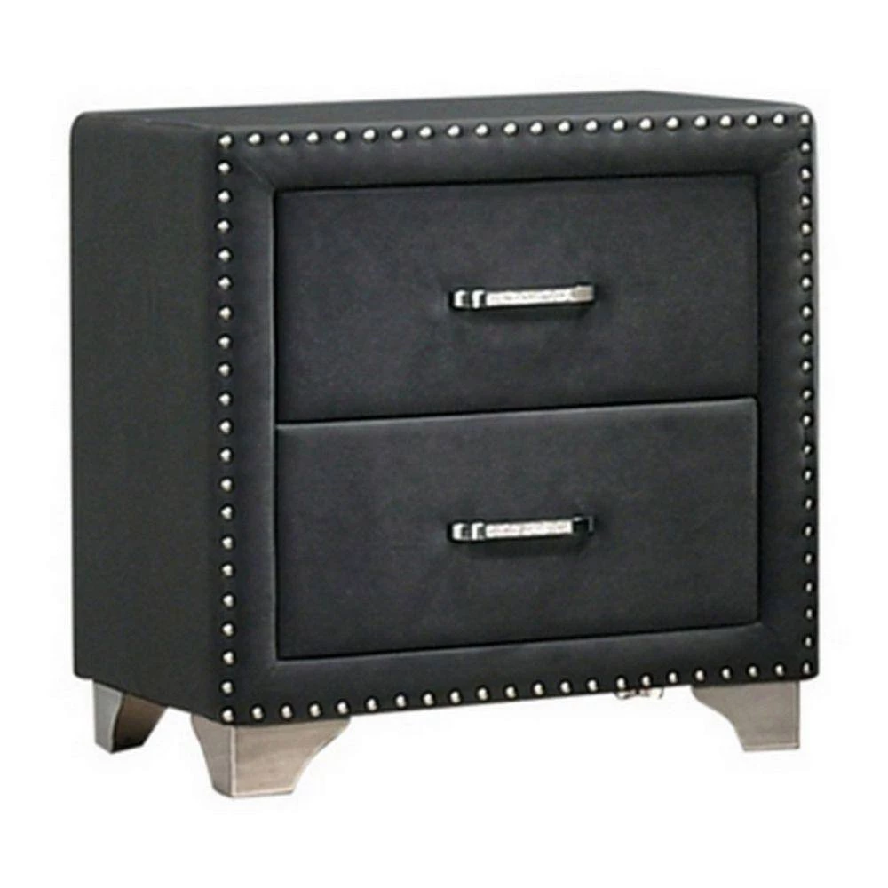 A distinctly beautiful addition to any bedside, this modern wood nightstand is upholstered in dark gray velvet for a uniquely striking aesthetic appeal. It is also equipped with 2 whisper quiet gliding drawers and a nailhead trim, making it a perfectly elegant place for keeping your nightly essentials and valued possessions. Check out our Cale collection for matching items.