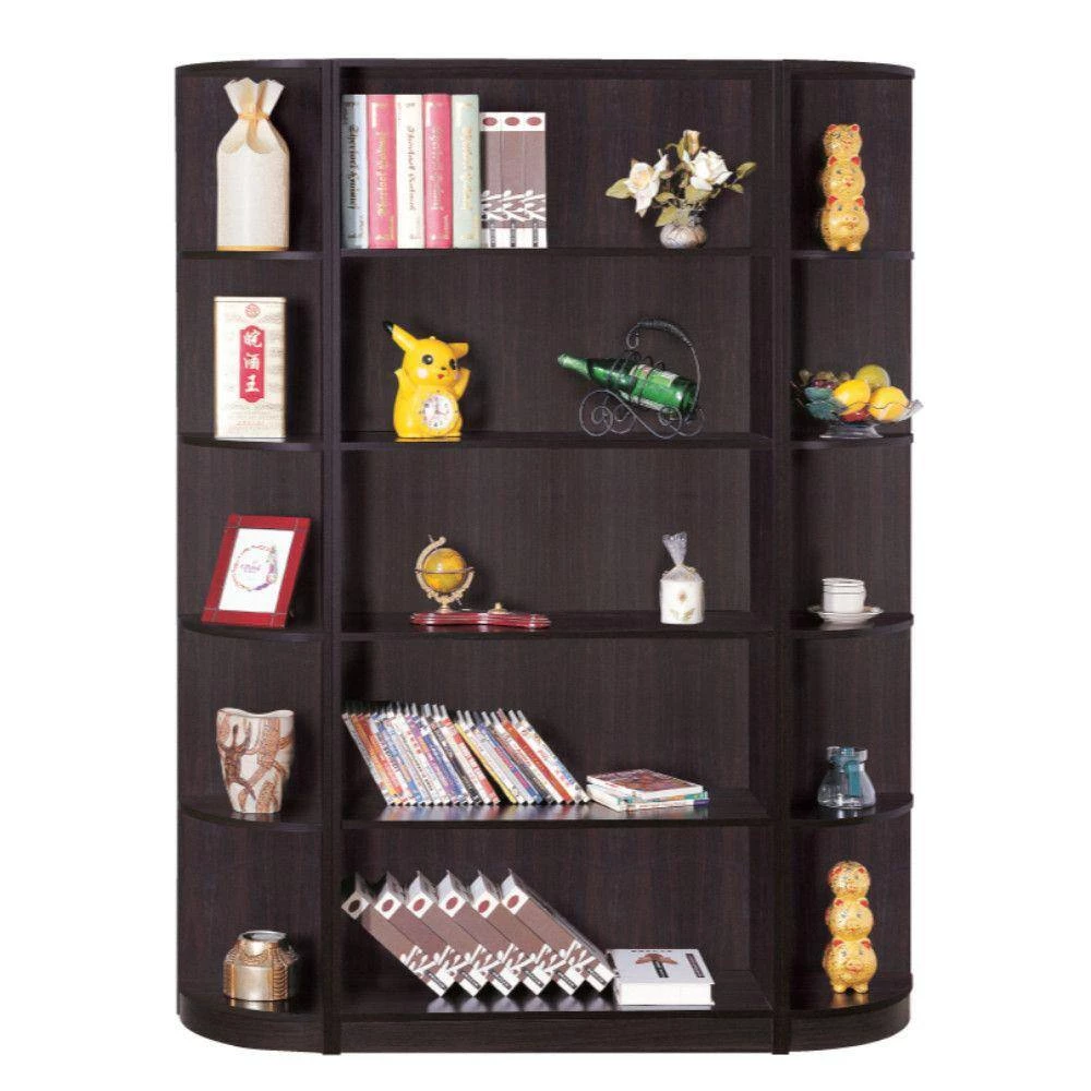 - Corner bookcase is finished in a long lasting dark brown laminate