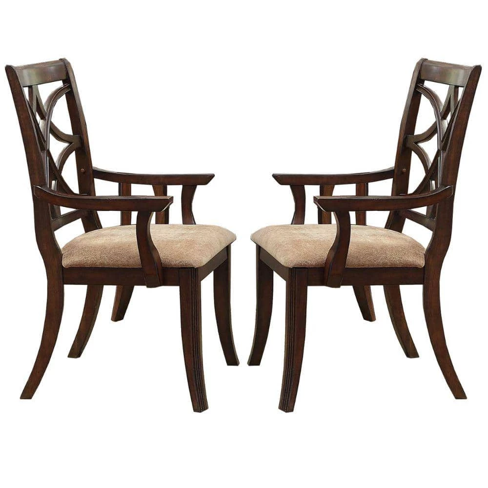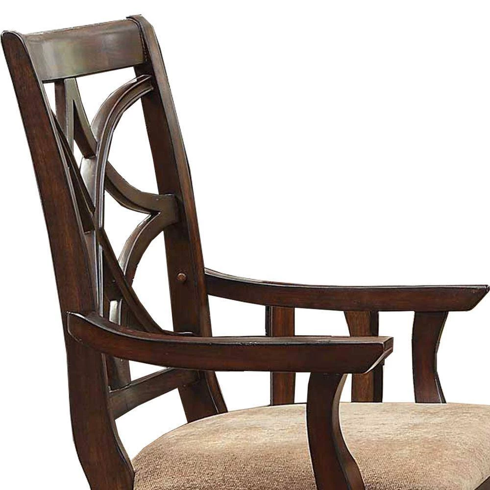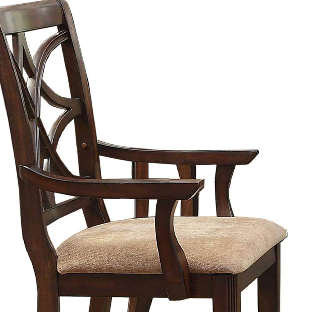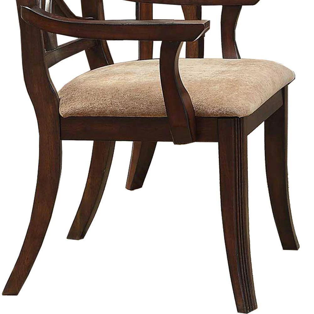 Expand your horizons of interior decoration with this transitional style arm chair. Solid wooden frame with carved detailings and a designer curved back in cherry brown finish, this chair carries a contrasting beige finish velvet like fabric upholstered on the seat area. You can pair it up with matching dining table or can adorn it in study, living and entry area also.