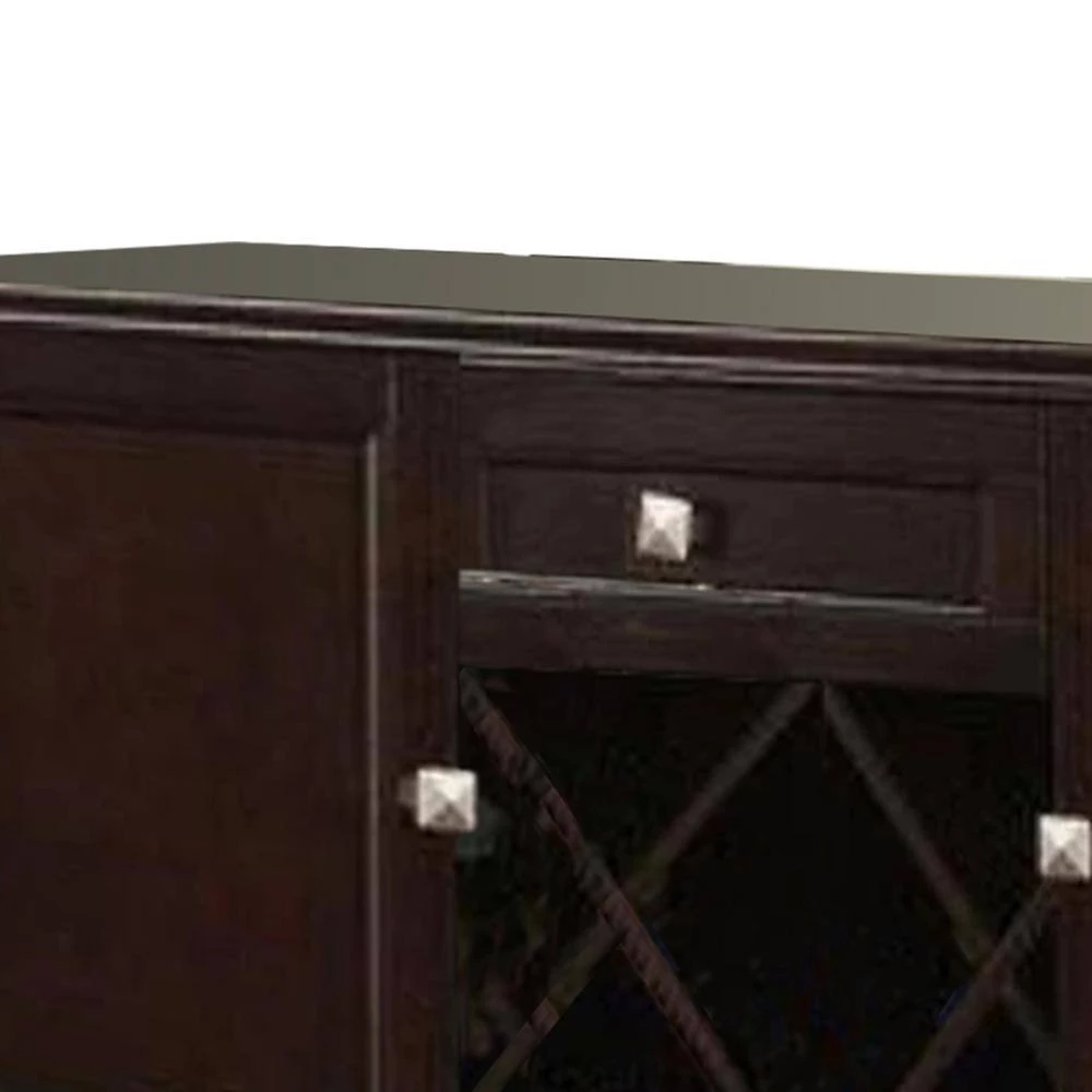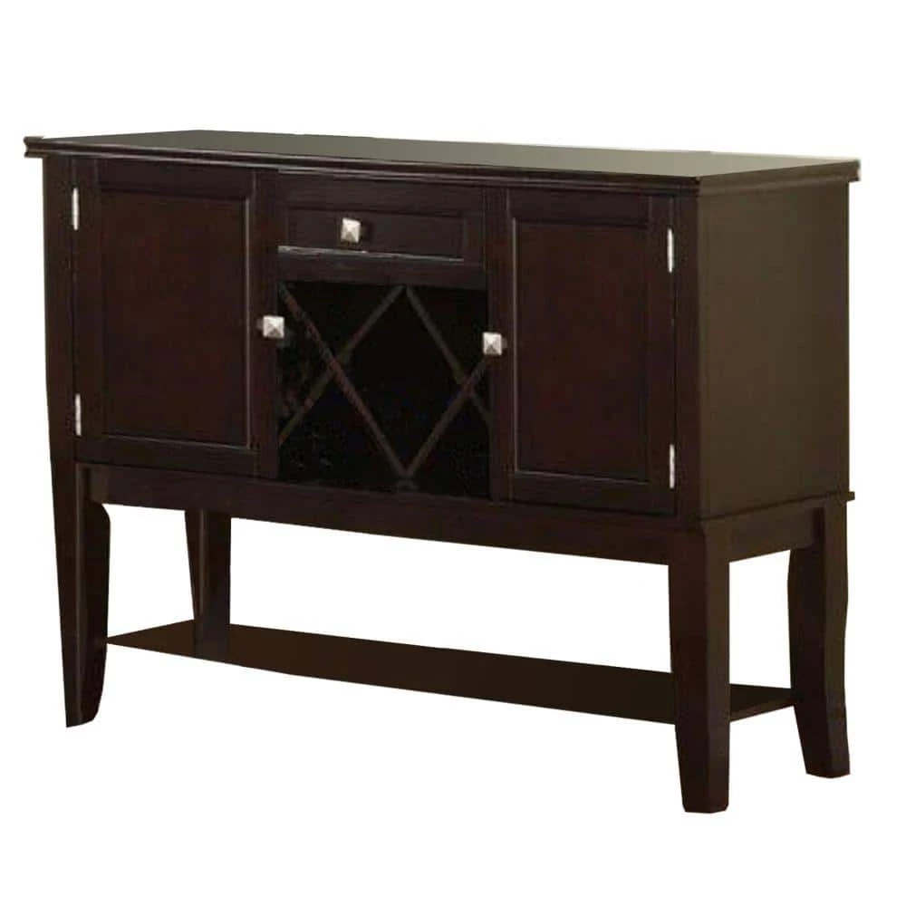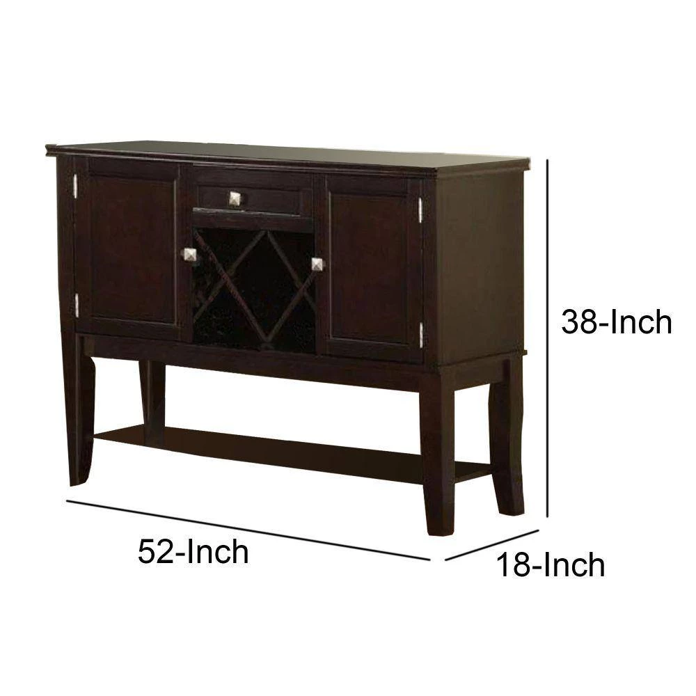 Cast a debonairly fun addition to your dining room like this functional Server. Crafted from rubber wood, MDF and birch veneer, the server is centered with wine bottle holders and features an open bottom shelf. It does not include any other featured product other than a Server.