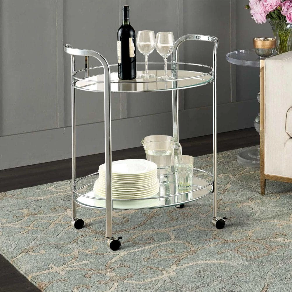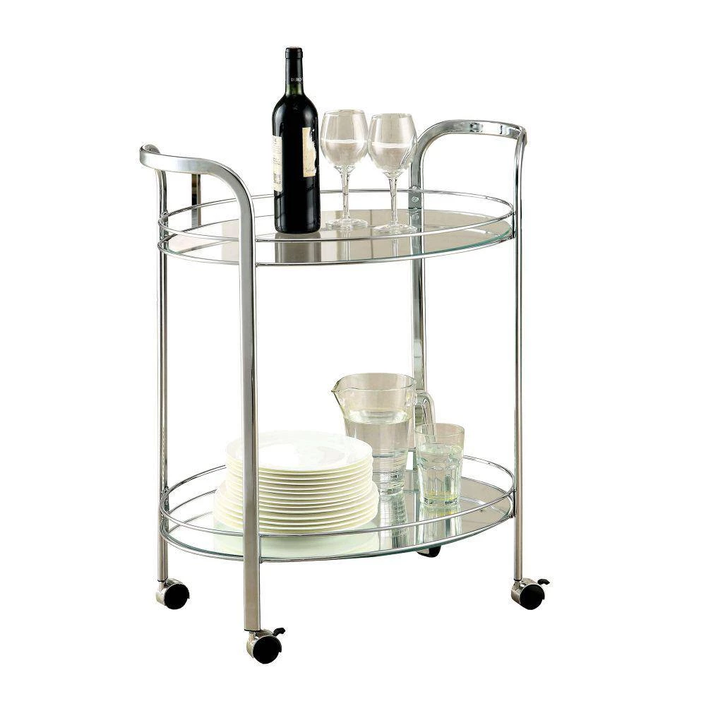 With a chrome base structure, this contemporary style serving cart delivers a level of elegance with a touch of modern decor. Perfect addition to any modern furnishings. It has wide handles with four wheels at the bottom, making it easy to relocate.