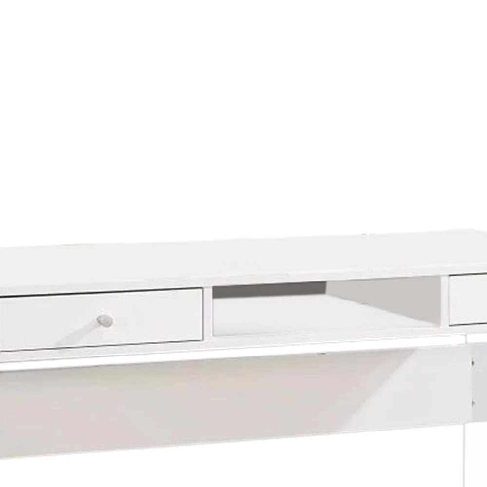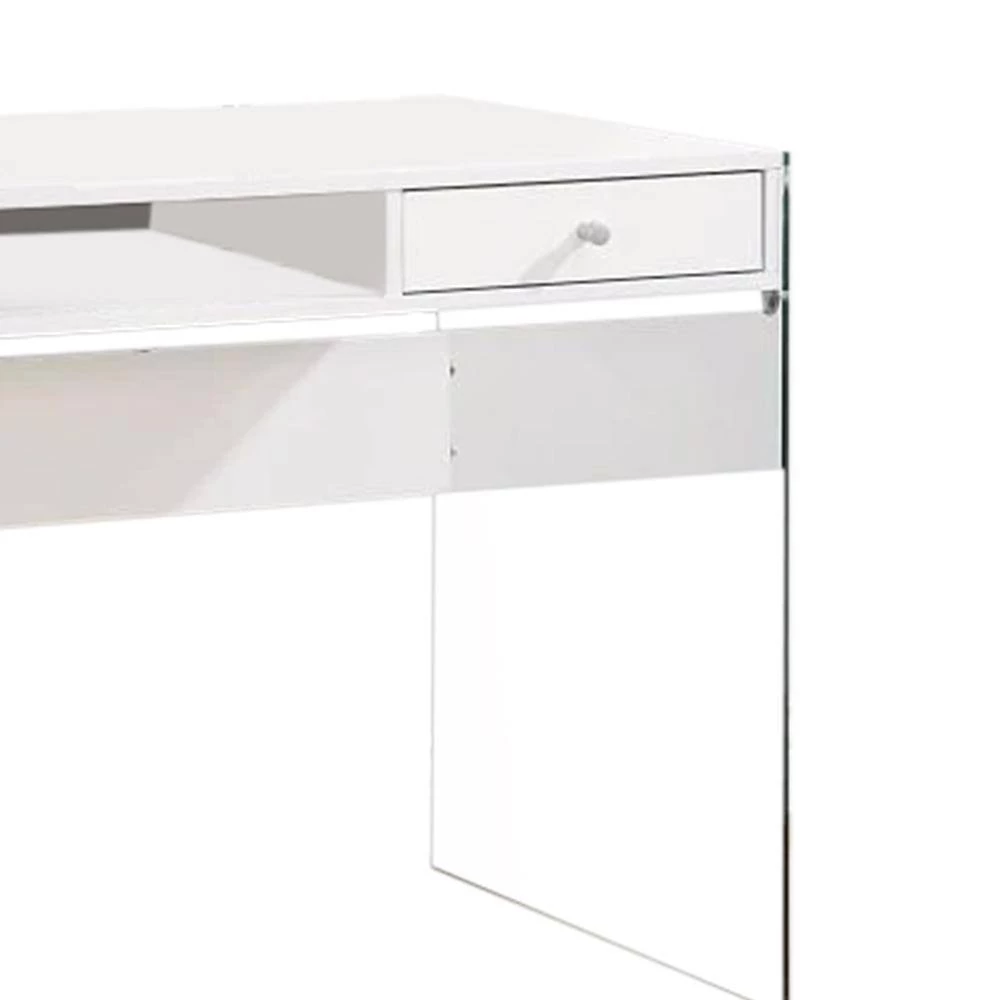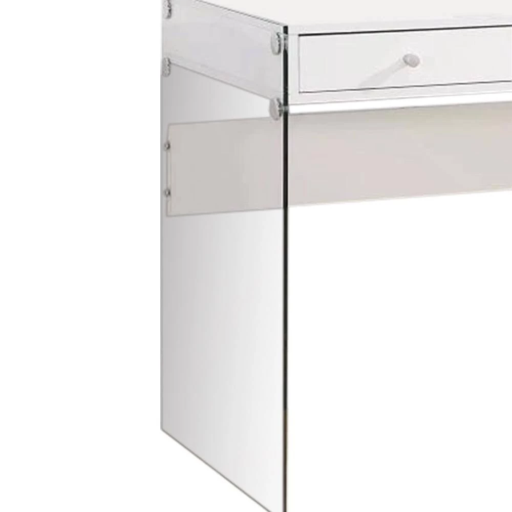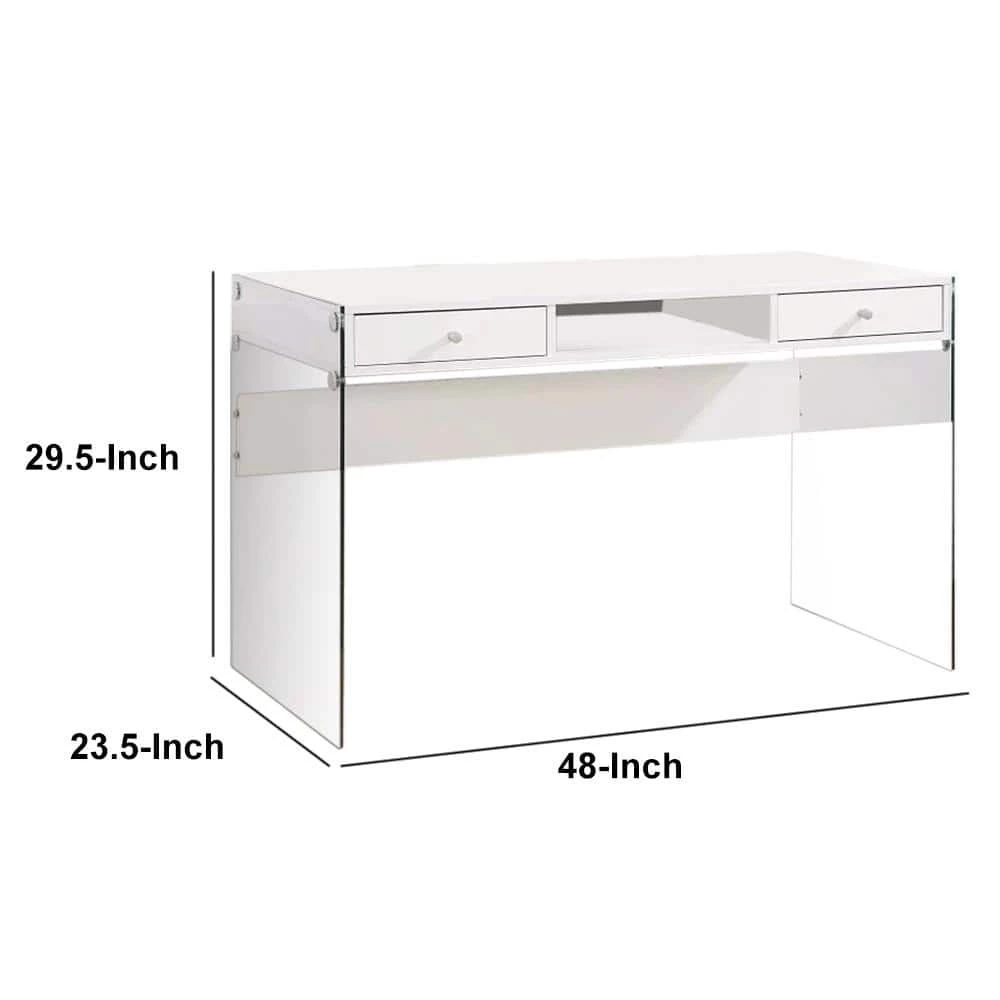 A unique blend of contemporary style and sleek design, this luxuriously built writing desk is finished in glossy white with thick tempered glass side panels and features two drawers with an open center compartment. Ample space and an uber modern look. What’s not to love.
