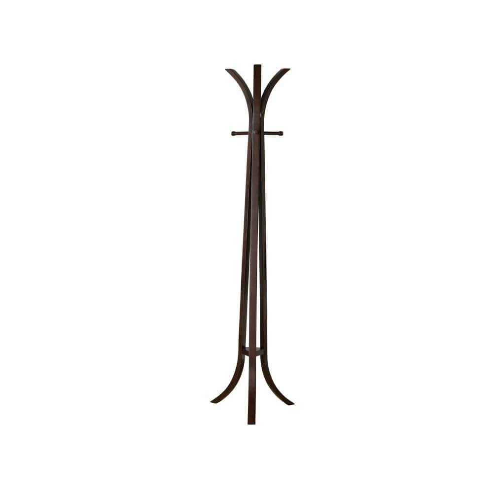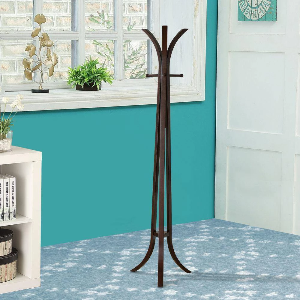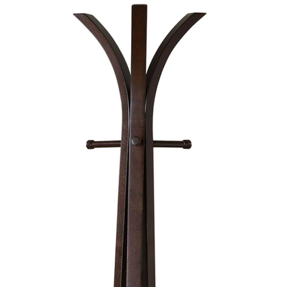 Complete the functionality of your living room with the contemporary lines and plentiful hanging room offered by this wood coat rack. Simple posts on the top offer stylish coat, mitten and hat storage and make organizing your living room or entryway an easy task. A uniquely shaped wood top is echoed on the base for a balanced and symmetrical finish.