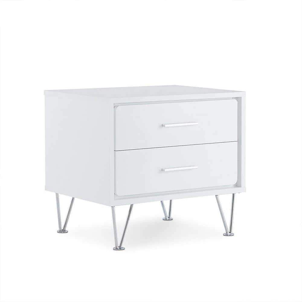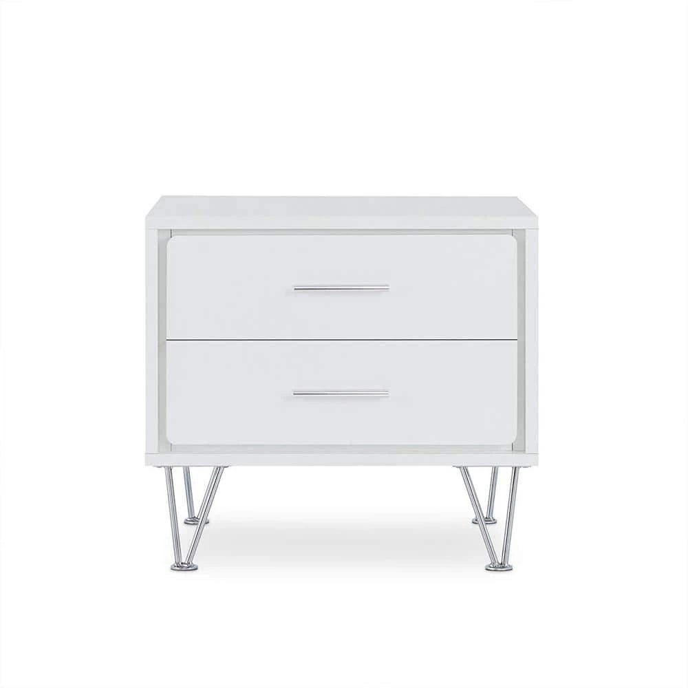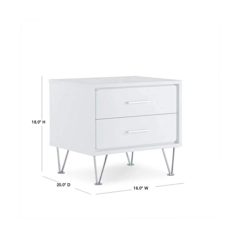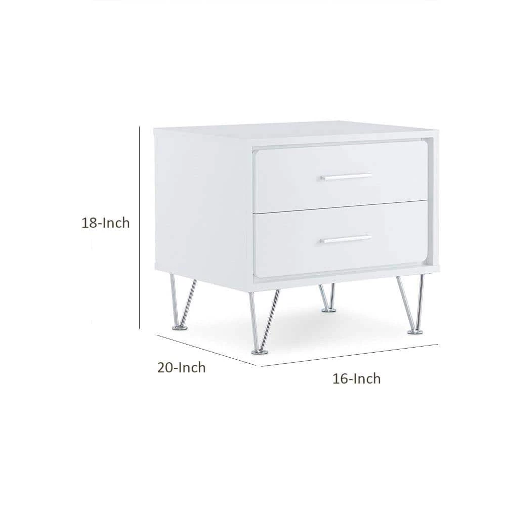 Featuring a unique leg design the night stand is functional as an end table too. The mixture of white and chromed hardware and leg, adds a lot of modern style to this 2 drawer night stand. It will be the great additional to your bedroom.