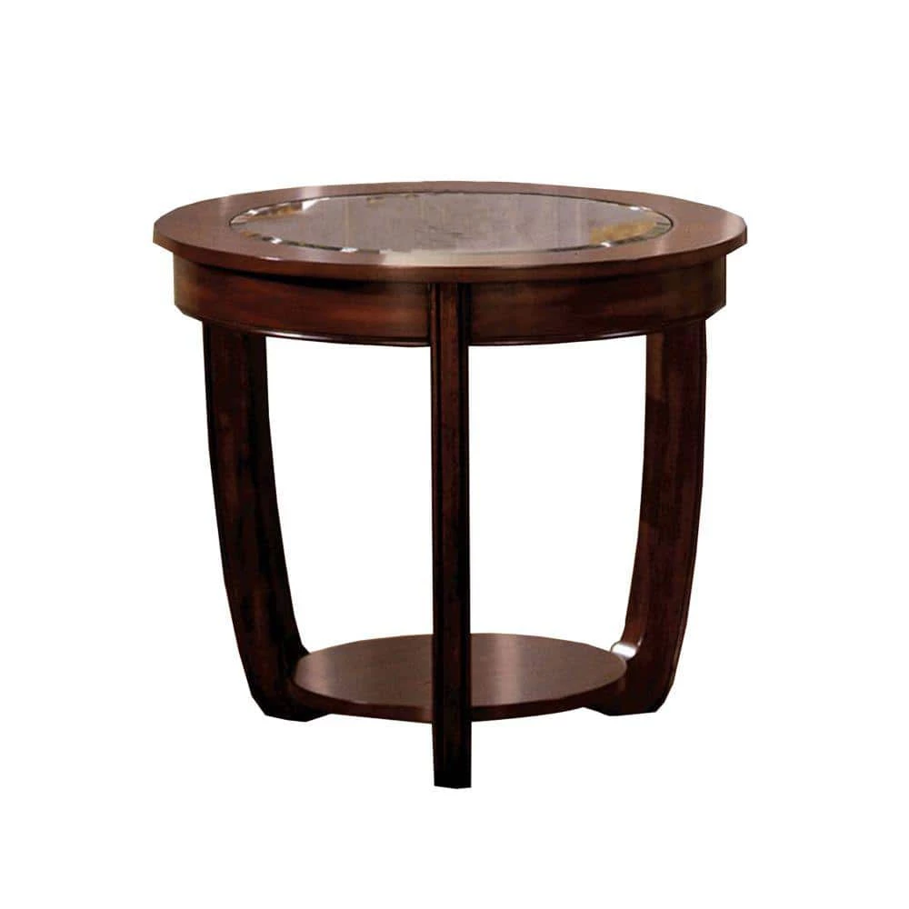 The gentle curves of these contemporary end table will add style to any living area. Table has a beveled glass top and are finished in dark cherry. Made with solid wood and veneers. It will enhance the look of the room.