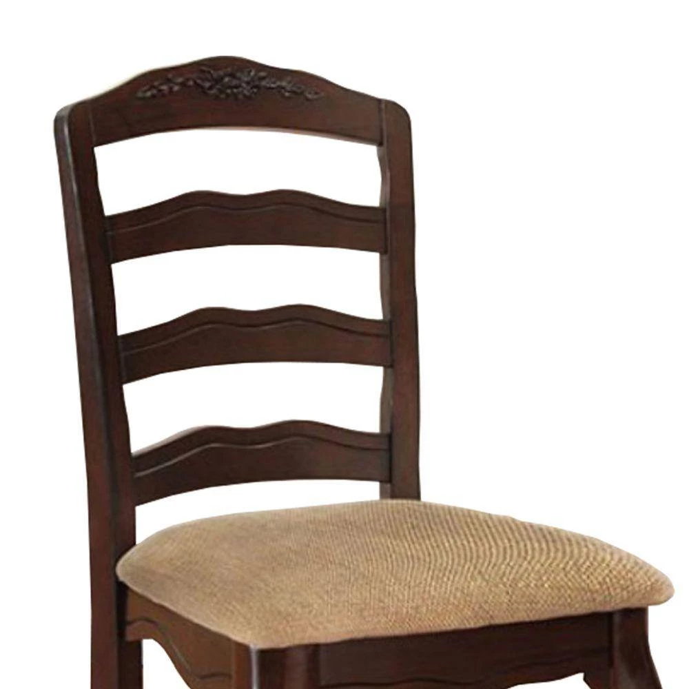 The side chair features padded seats with a delicate floral motif. The matching side chairs feature padded seats with a delicate floral motif. The ladder design back has soft, curvy lines instead of straight ones, while the front legs use of queen anne style enforces this theme of delicateness.