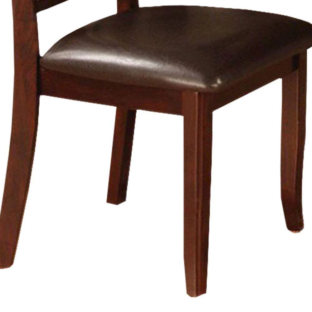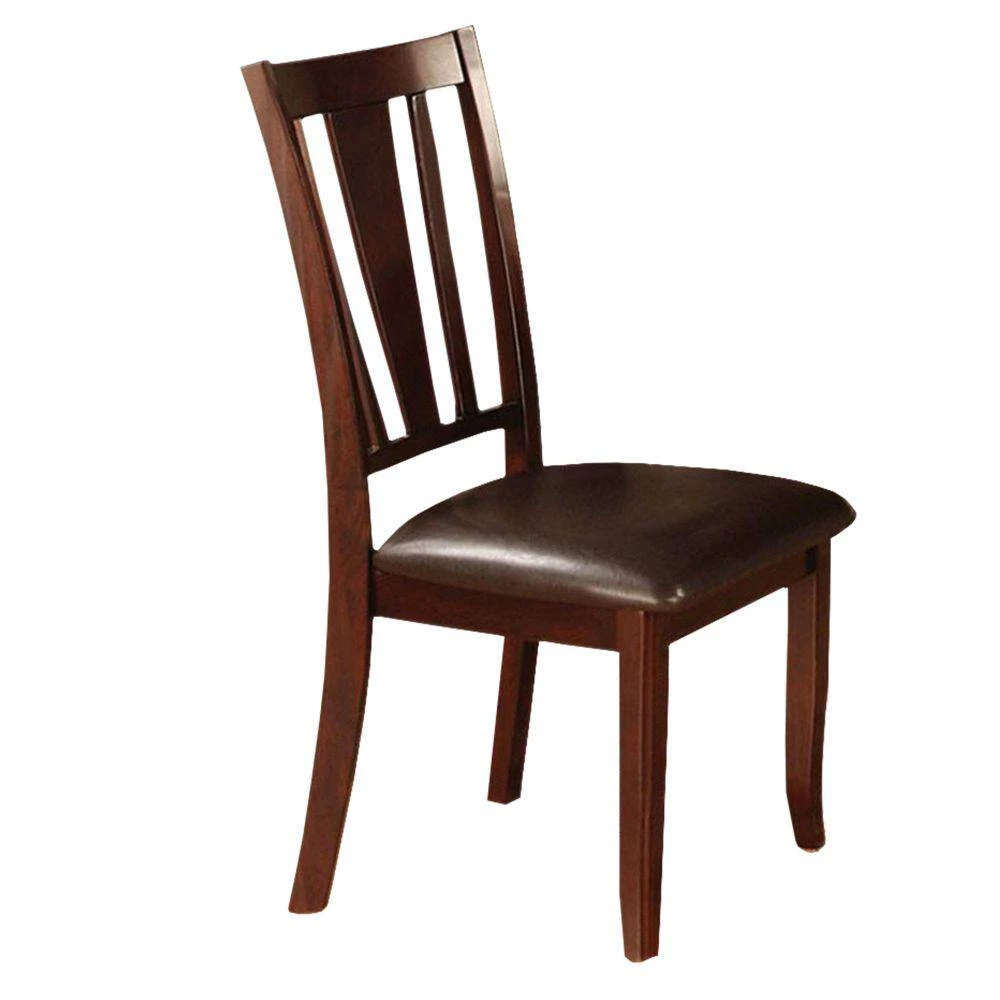 A dark espresso finish make this transitional side chair will be an attractive addition to any dining space. The seats are padded leatherette providing comfort.The back are made of simple lines and shapes for that transitional look.