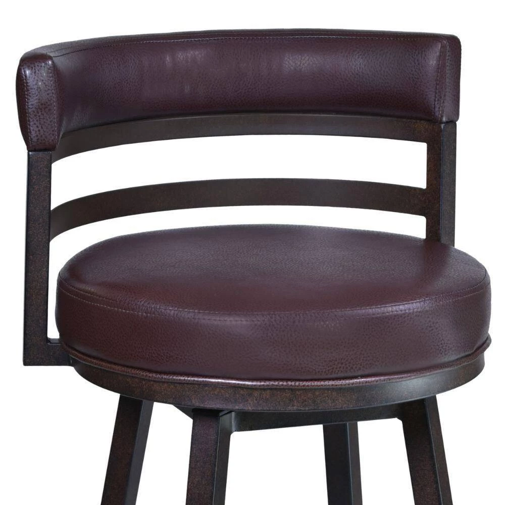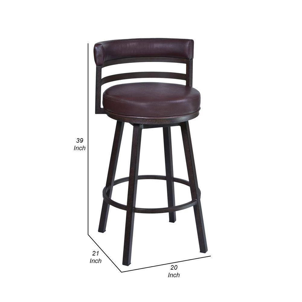 Add a modern touch to your living room, kitchen bar, or bar height dining table with this stylish and well crafted bar stool. Upholstered with auburn brown vegan faux leather, it has an open, curved back and a round foam infused cushioned seat with a 360° swivel mechanism, perfect for comfort and ease of movement all evening long. Check our Eva collection for matching items.