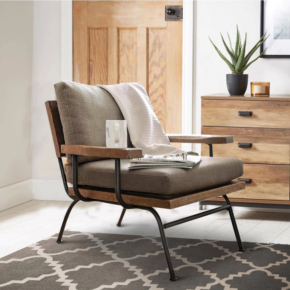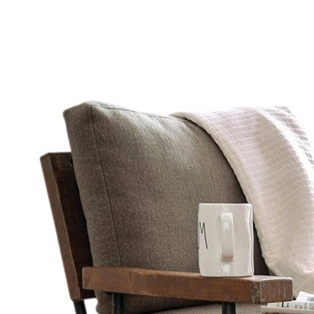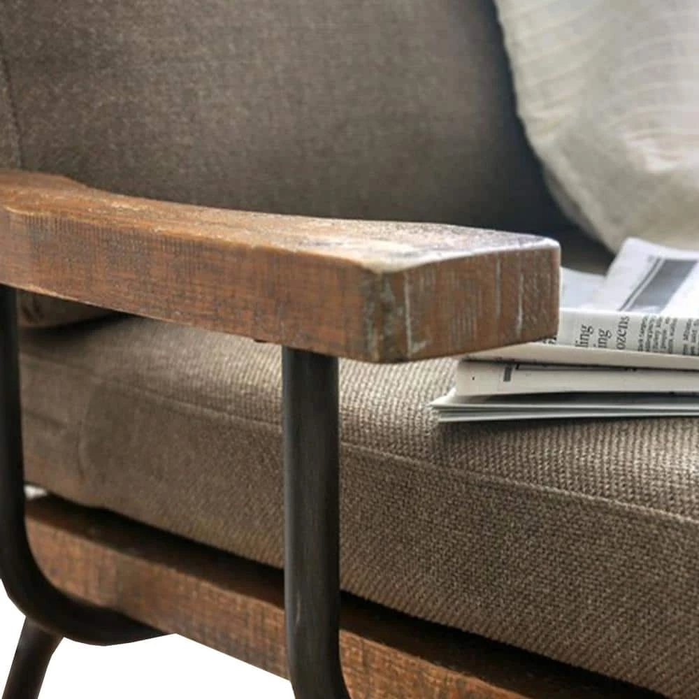 This rustic style accent chair provide a sophisticated look to your living room. Features padded fabric upholstery with wooden frame and metal legs. This chair is perfect as an accent chair in a living room or a luxurious side chair at a dining table.