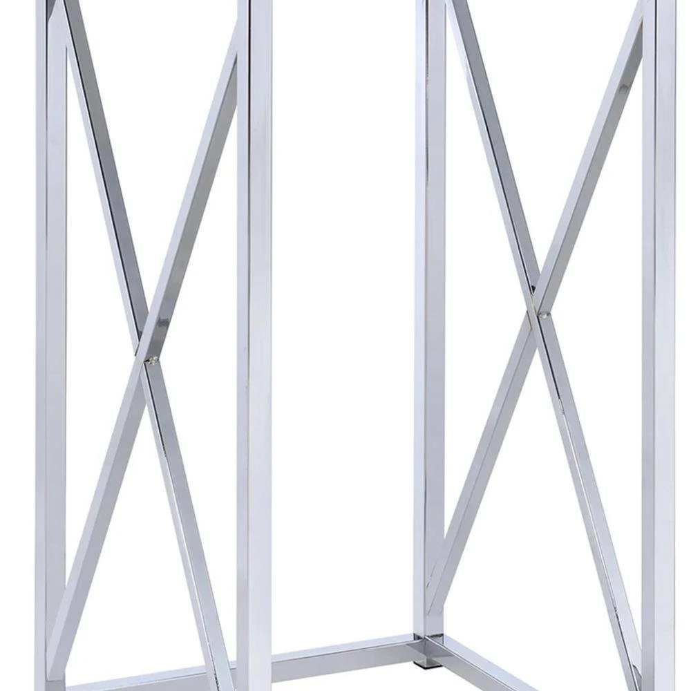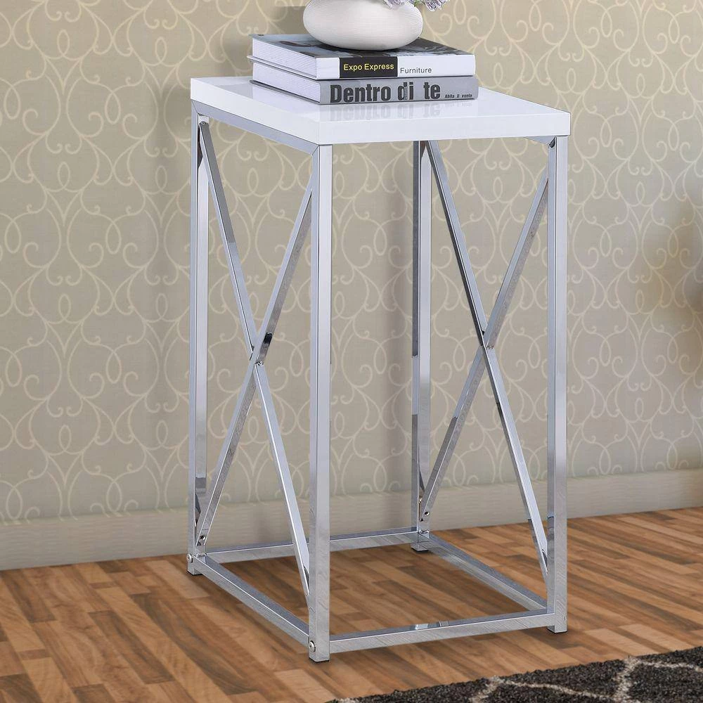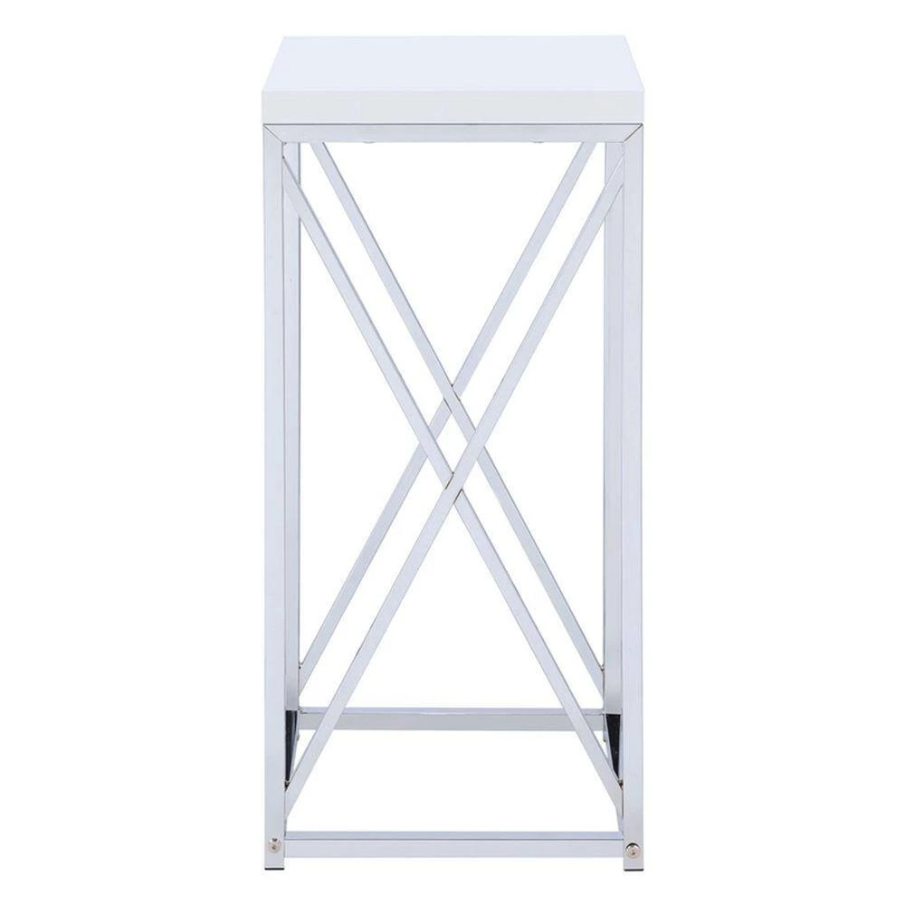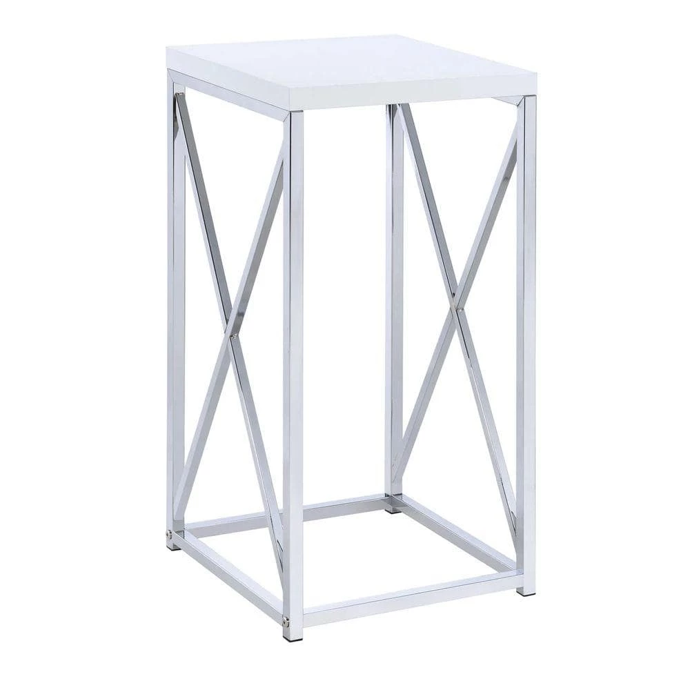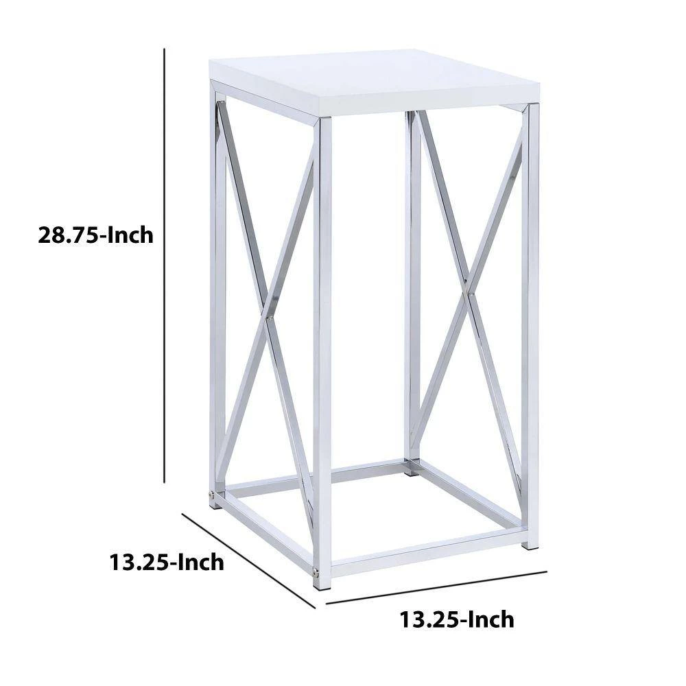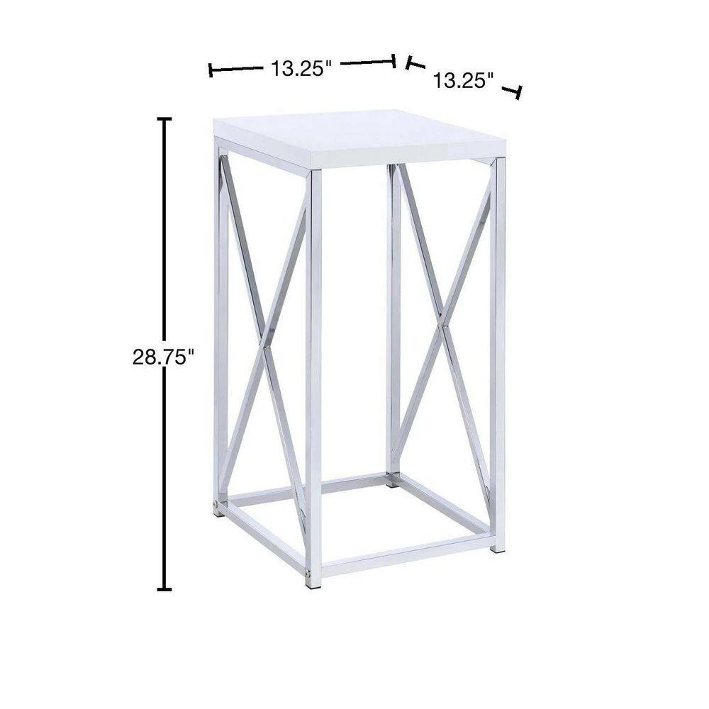 Inspiring design elements, this square shaped accent table makes an elegant statement in your living room, bedroom or dining room. Constructed of solid metal. It features white top and chrome and silver finish base. A crisp antique glossy white finish gives contemporary charm to this table. It Adds a touch of luxurious flair to any room in your home.