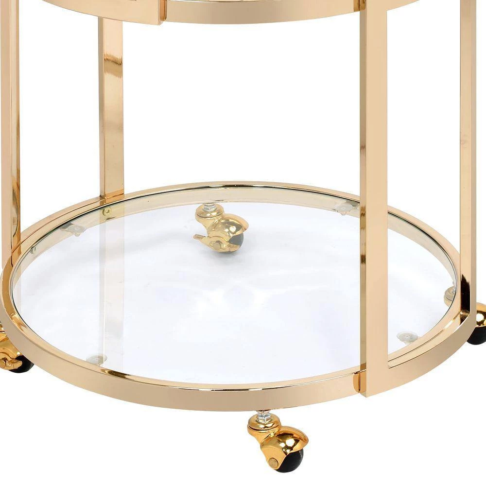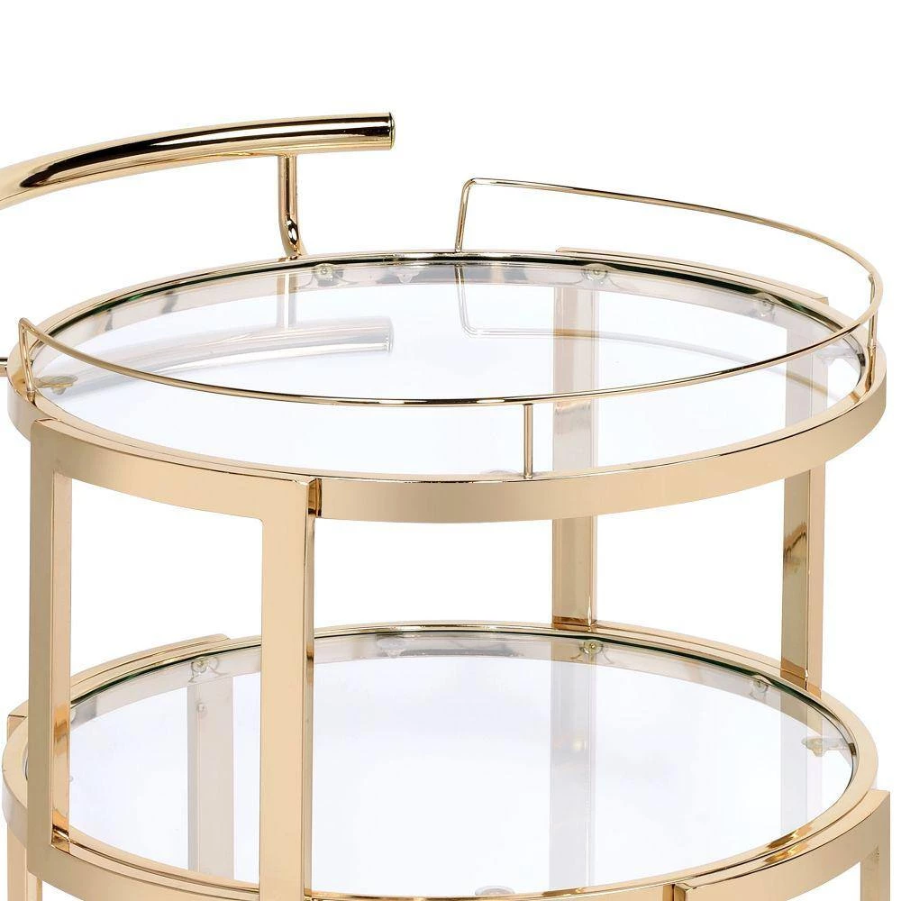 Serve your guests in a classy and stylish manner with the inclusion of this sturdy metal constructed serving cart featuring contemporary style. Showcasing 3 tier design, it has round glass shelves to keep your while bottles and other belongings. Casters are provided for easy mobility.