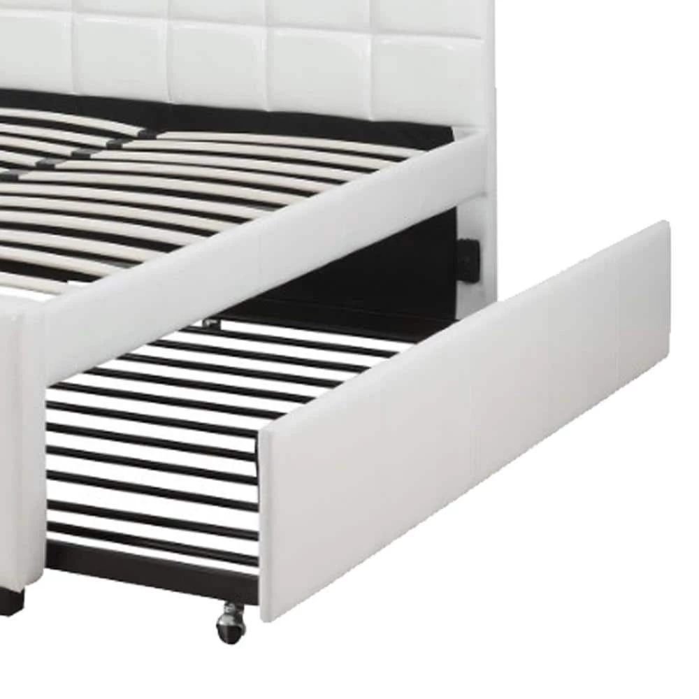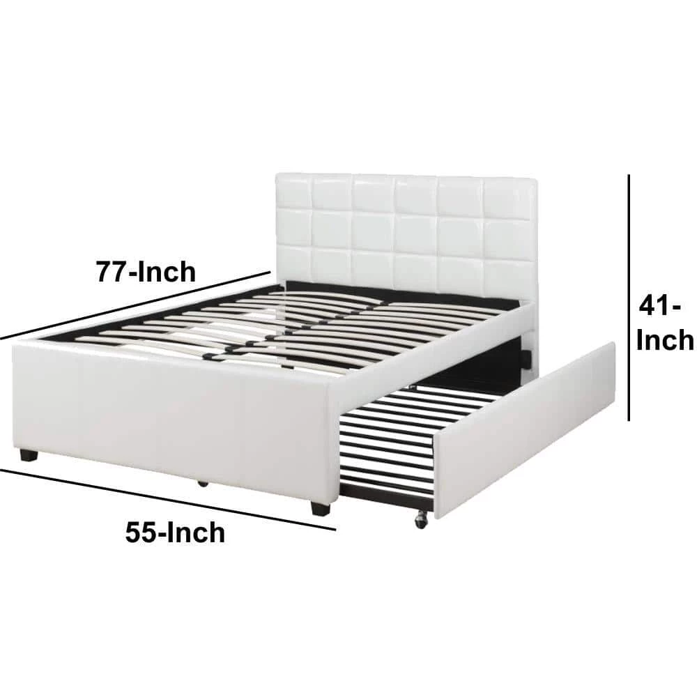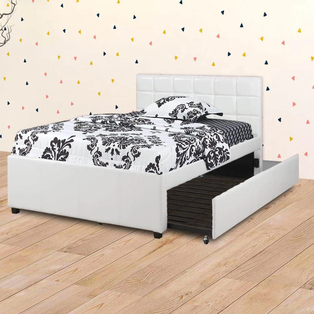 Great amalgamation of style and function its a pragmatic furniture graced with beauty and practicality. Made of solid wood and white cushioned upholstered faux leather on the headboard, this bed is a graceful presence in your bedroom space. It also includes a lower trundle with extra sleeping space for a guest. It does not include any other featured product other than a bed frame.