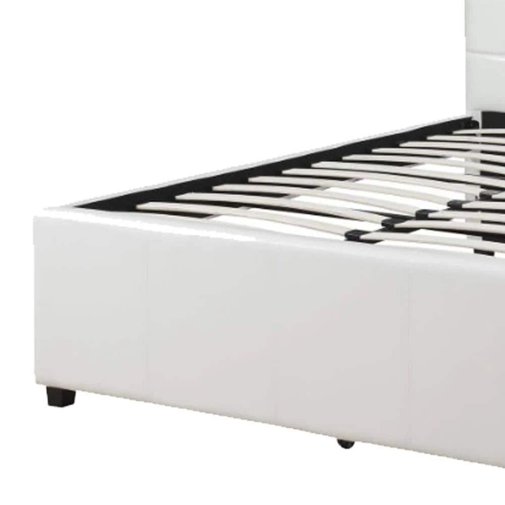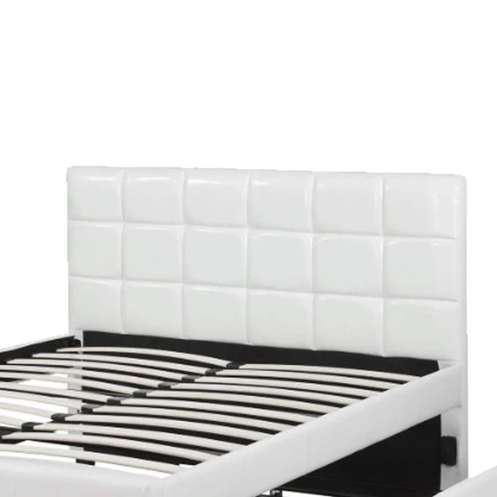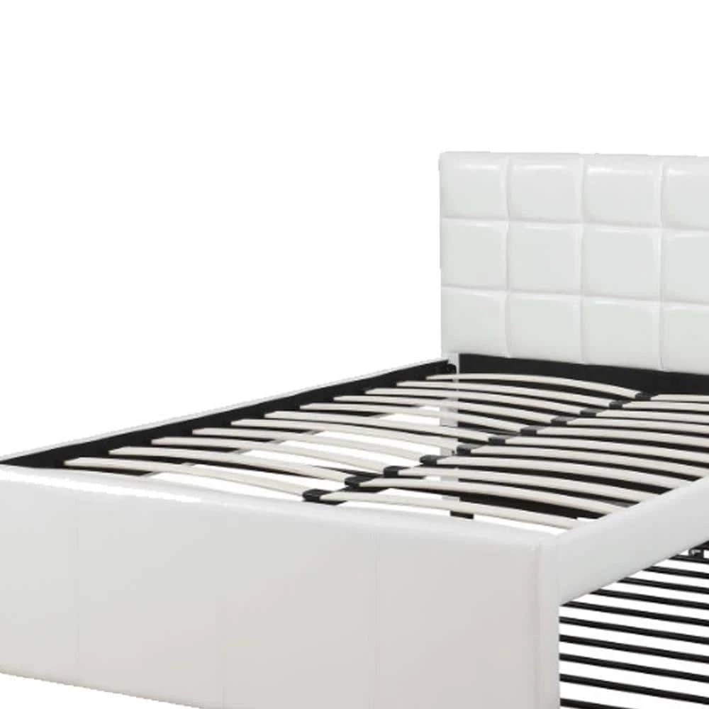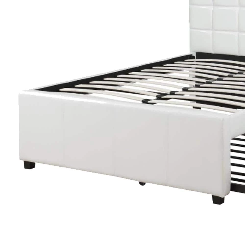 Great amalgamation of style and function its a pragmatic furniture graced with beauty and practicality. Made of solid wood and white cushioned upholstered faux leather on the headboard, this bed is a graceful presence in your bedroom space. It also includes a lower trundle with extra sleeping space for a guest. It does not include any other featured product other than a bed frame.