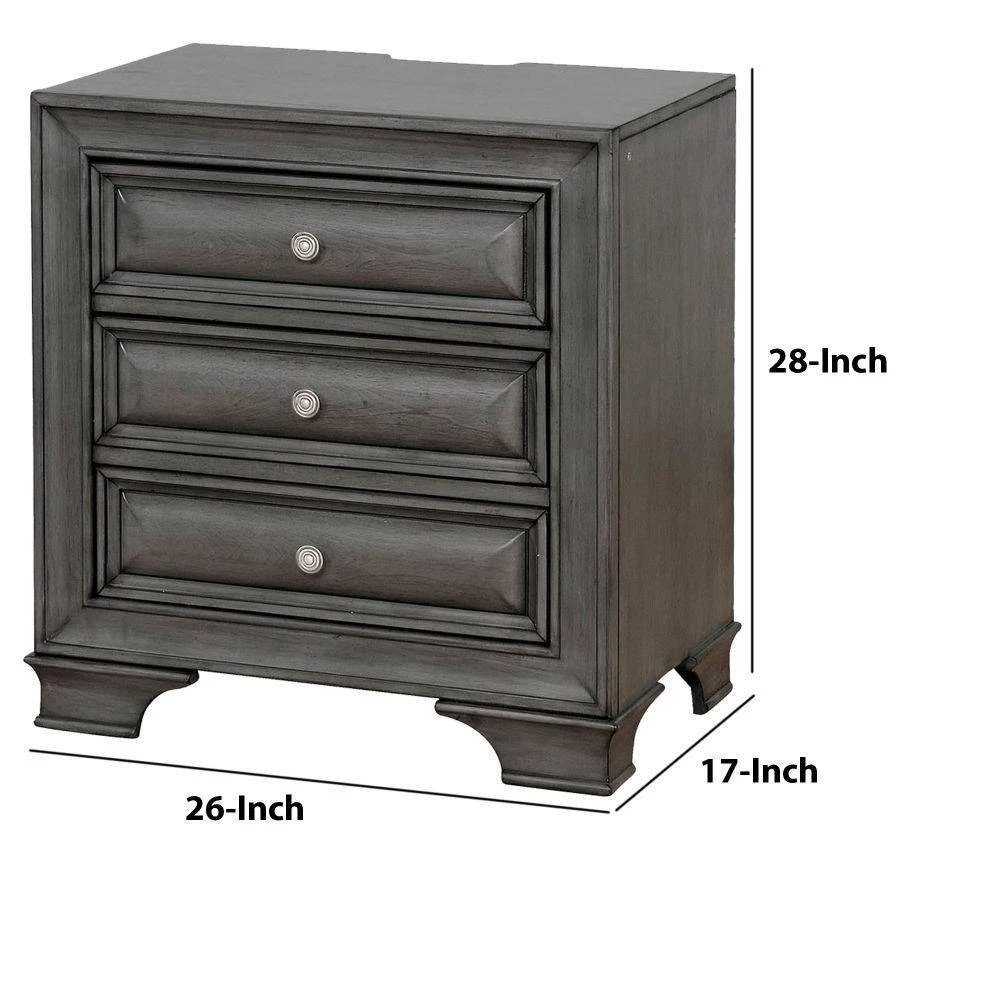 Add a nuance of luxury to your humble abode with this absolutely stunning transitional style wood night stand featuring 3-drawers for ample storage option. Finished in a gray color, this night stand features English dovetail construction design which allows for large storage capacity. For added convenience, this night stand comes with a night light under the stand.