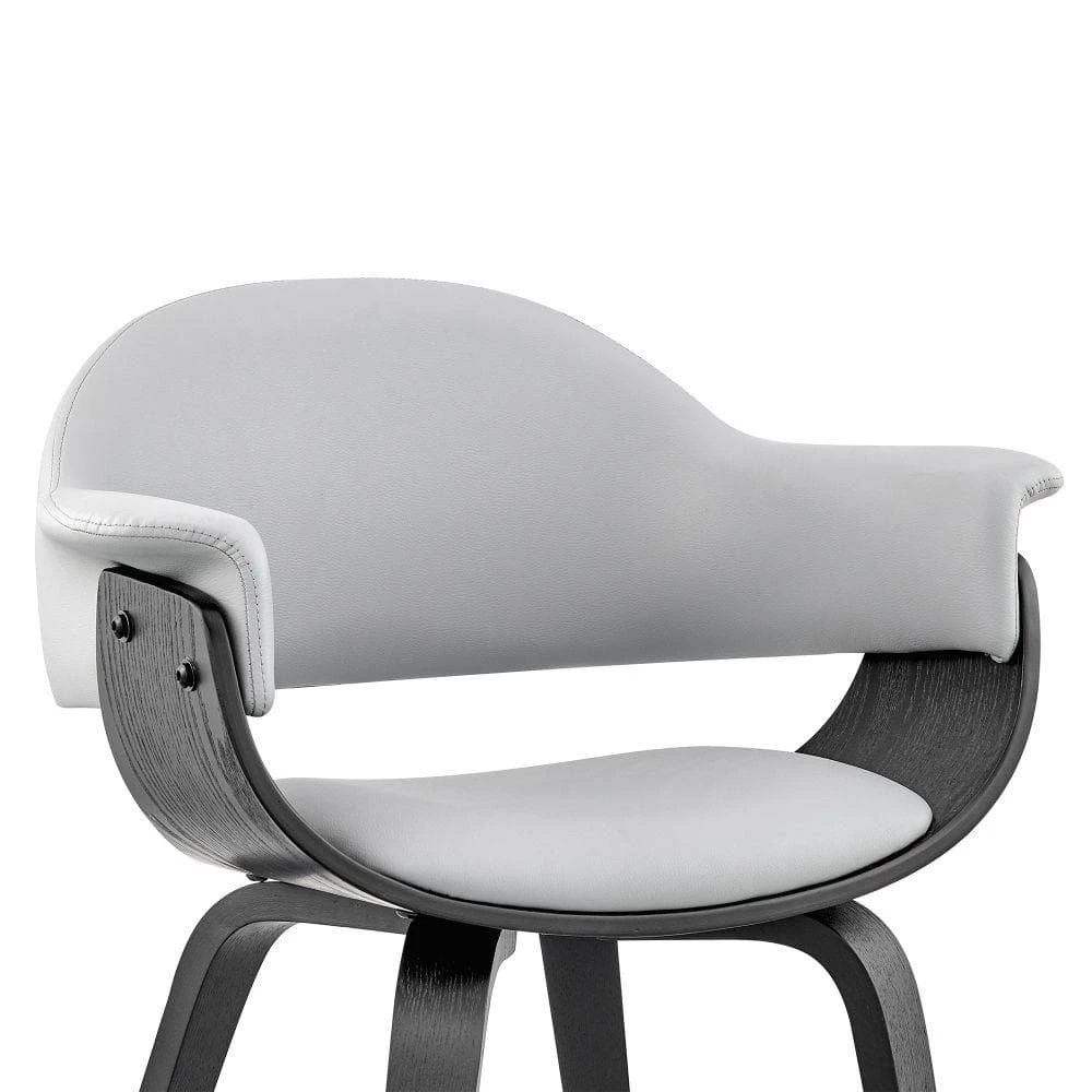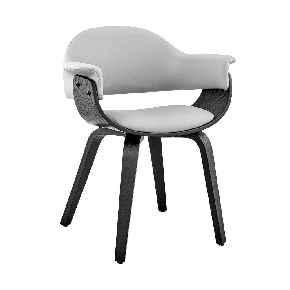 Enjoy sophisticated dining by bringing in this contemporary style inspired Dining Chair. Incorporated with curved padded seat and ergonomically designed cushioned backrest. It is constructed sturdily from plywood frame and is upholstered in gray tone faux leather. The aesthetically visible grain details on the flared legs, add a nature inspired appeal to it.