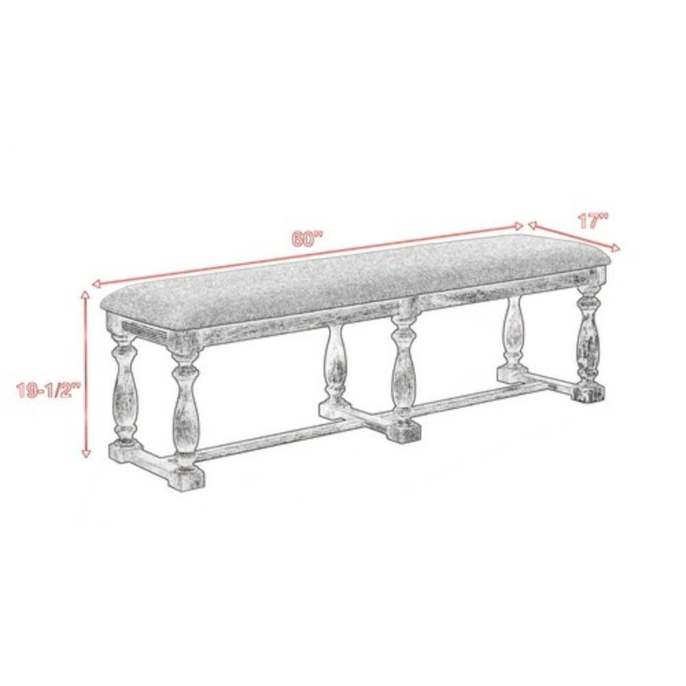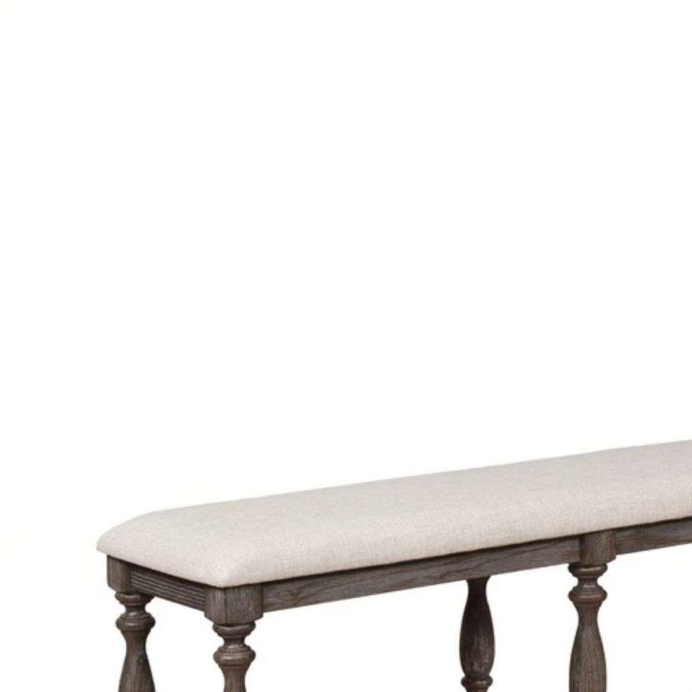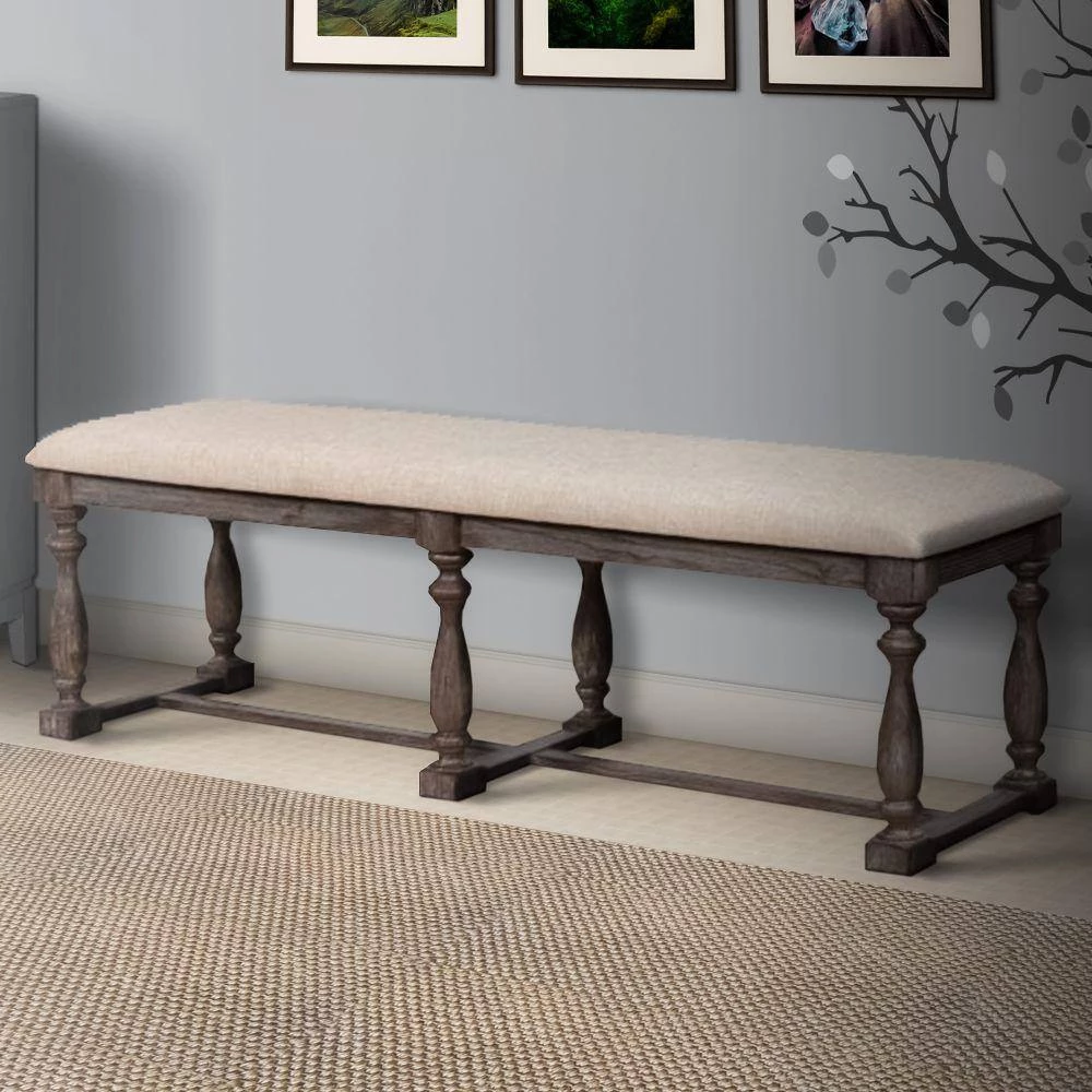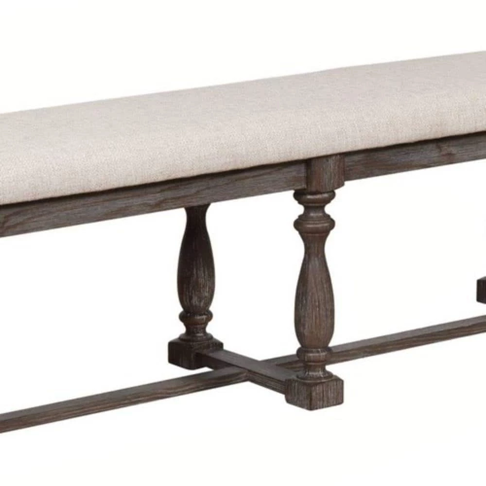 Add a farmhouse look to your modern looking home with this bench featuring sturdy wooden construction accented with weathered finish. Supported on turned pedestal base and conjoined with trestle support. It has padded fabric seating which aims to ensure utmost comfort.