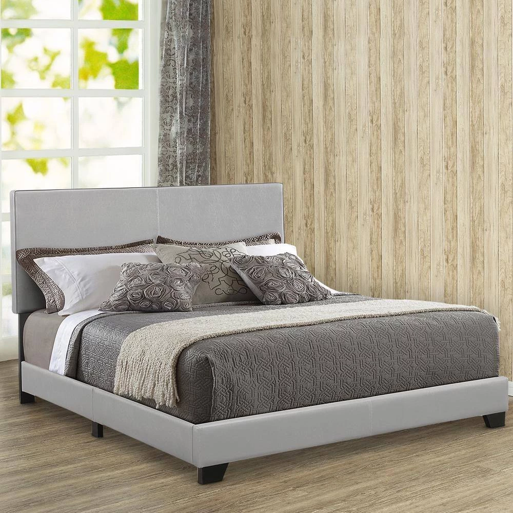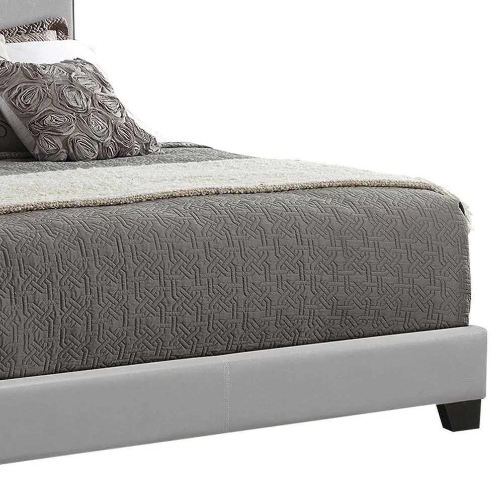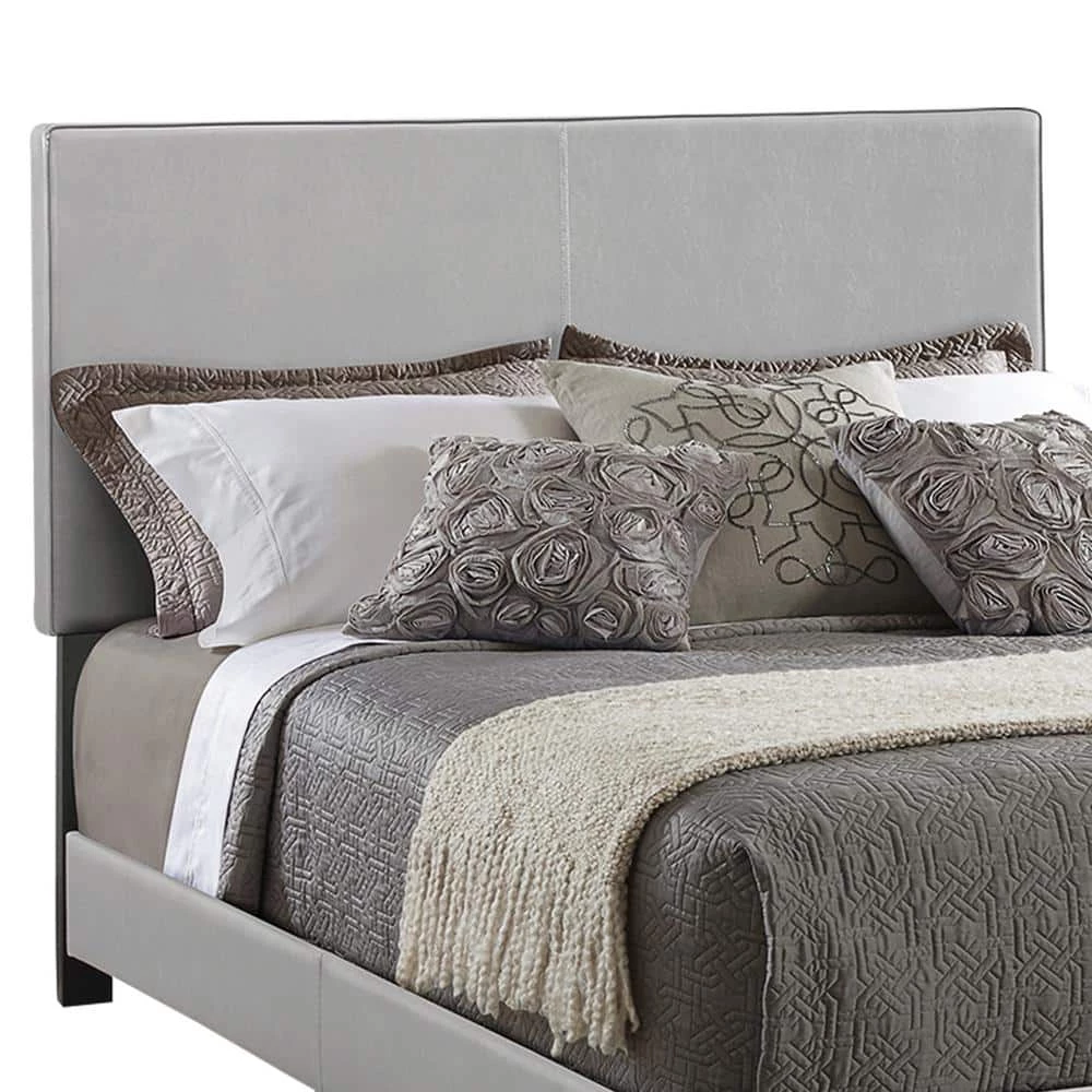 This Contemporary Queen Size Platform Bed makes a handsome addition to your bedroom. Constructed of solid hardwood and upholstered in Gray leather, this fantastic Queen Size bed will easily incorporate into any decor style. The tall headboard has a simple design with top stitching details. The side rails and foot board are also upholstered and features a low profile. Lifted on exposed wooden feet, this upholstered Queen Size platform Bed is sure to complement your bedroom.