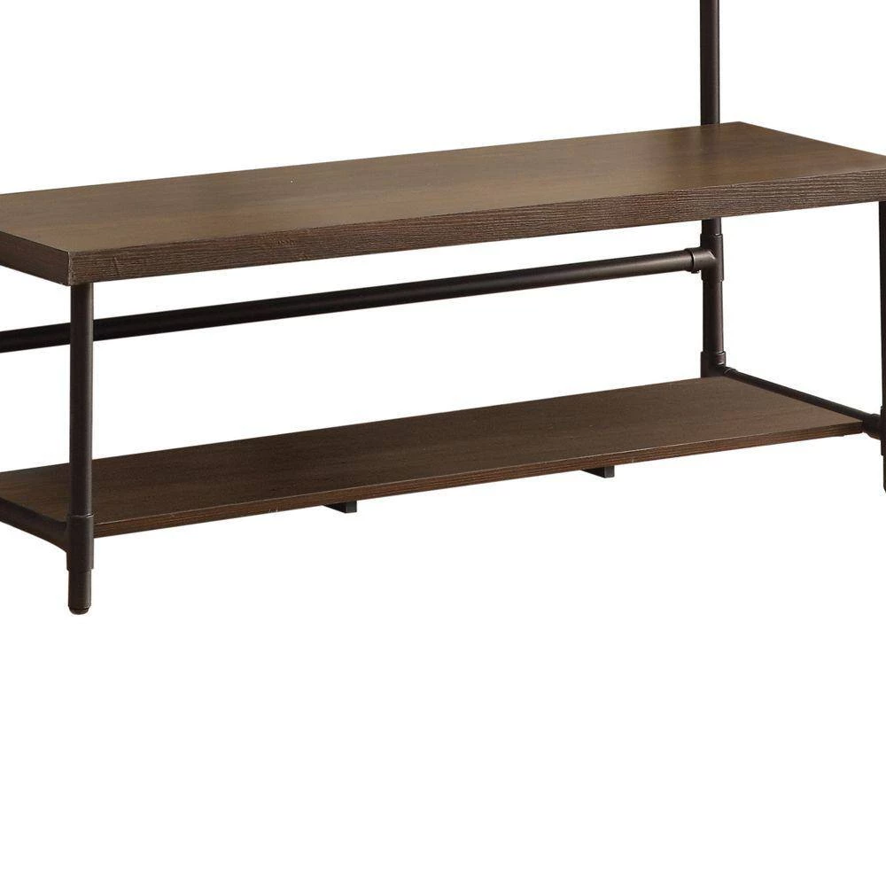 Add this hall tree into your entryway or anywhere in your living space to lend a sophisticated. It is made from sturdy reclaimed wood and supported by bronze finish pipe design metal framing. The five hooks at the top provide easy hanging of coats, belts, jackets and umbrellas while the built-in bench allows comfortable seating when tying shoes and the bottom shelf can be used for shoe storage. This industrial style furniture offers a valuable addition to your living space and easily blends with all styles.