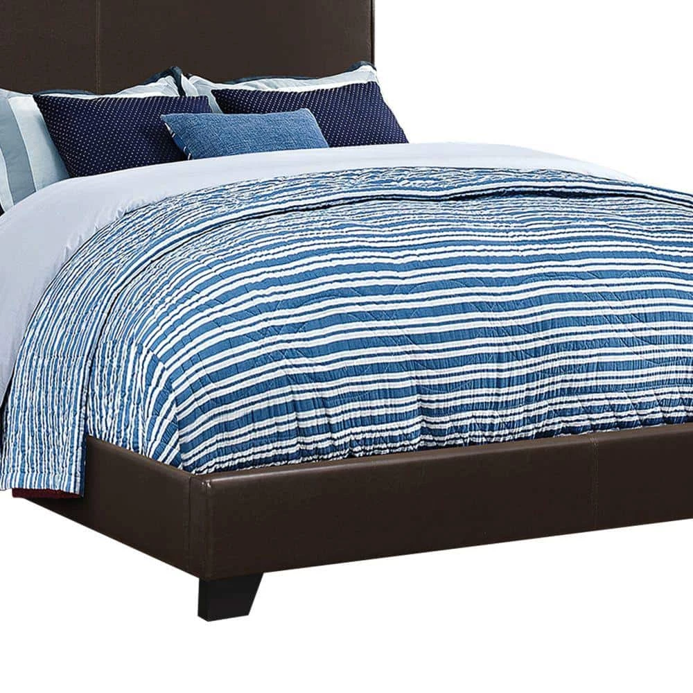 This Contemporary Queen Size Platform Bed makes a handsome addition to your bedroom. Constructed of solid hardwood and upholstered in Brown leather, this fantastic Queen Size bed will easily incorporate into any decor style. The tall headboard has a simple design with top stitching details. The side rails and footboard are also upholstered and features a low profile. Lifted on exposed wooden feet, this upholstered Queen Size platform Bed is sure to complement your bedroom.
