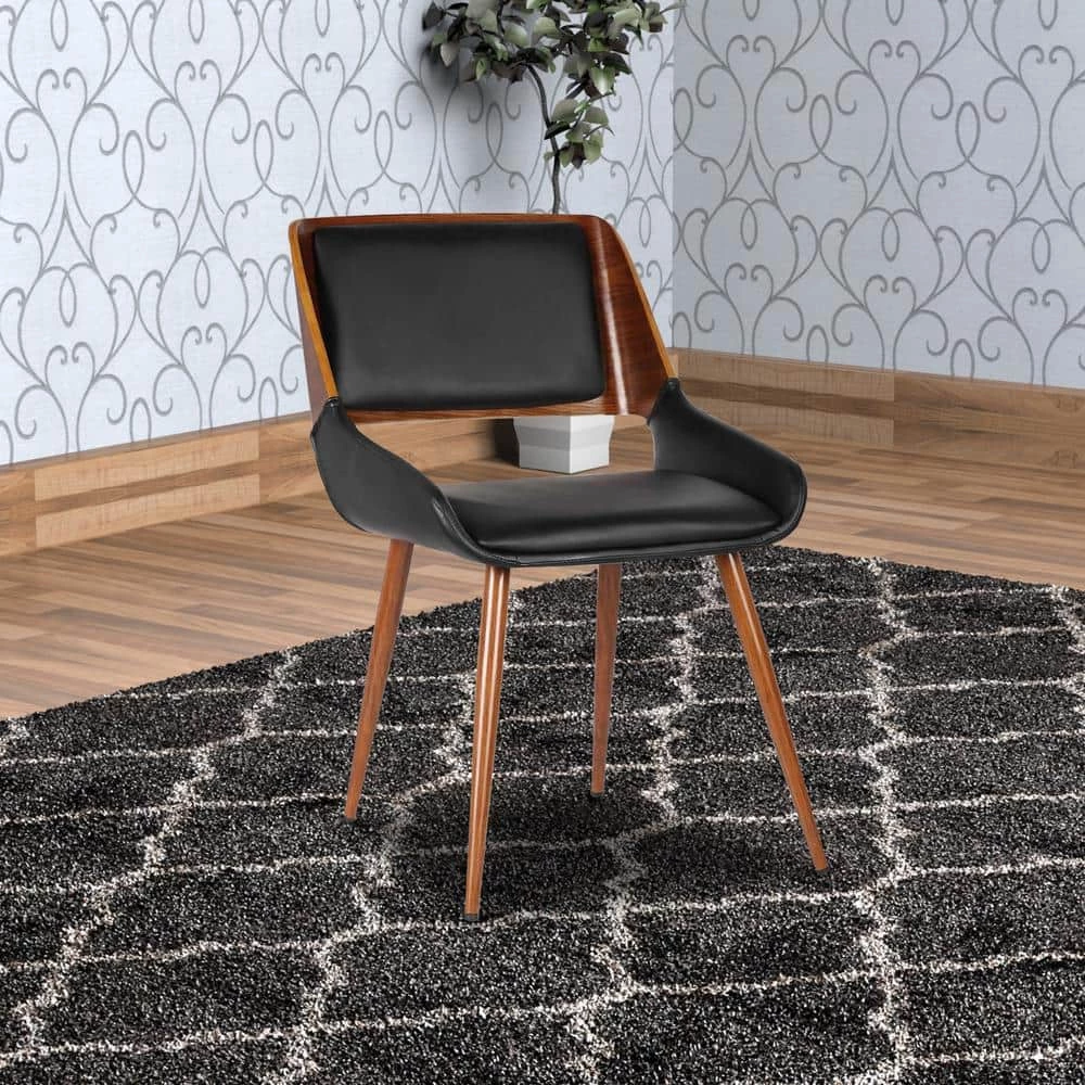 This Dining chair presents a perfect blend of mid century style with contemporary aesthetics. The chair is beautifully wrapped in black faux leather and features a padded split back. The round tapered metal legs in walnut wood finish round off the overall design, while the floor protectors prevent scratches to the floor.