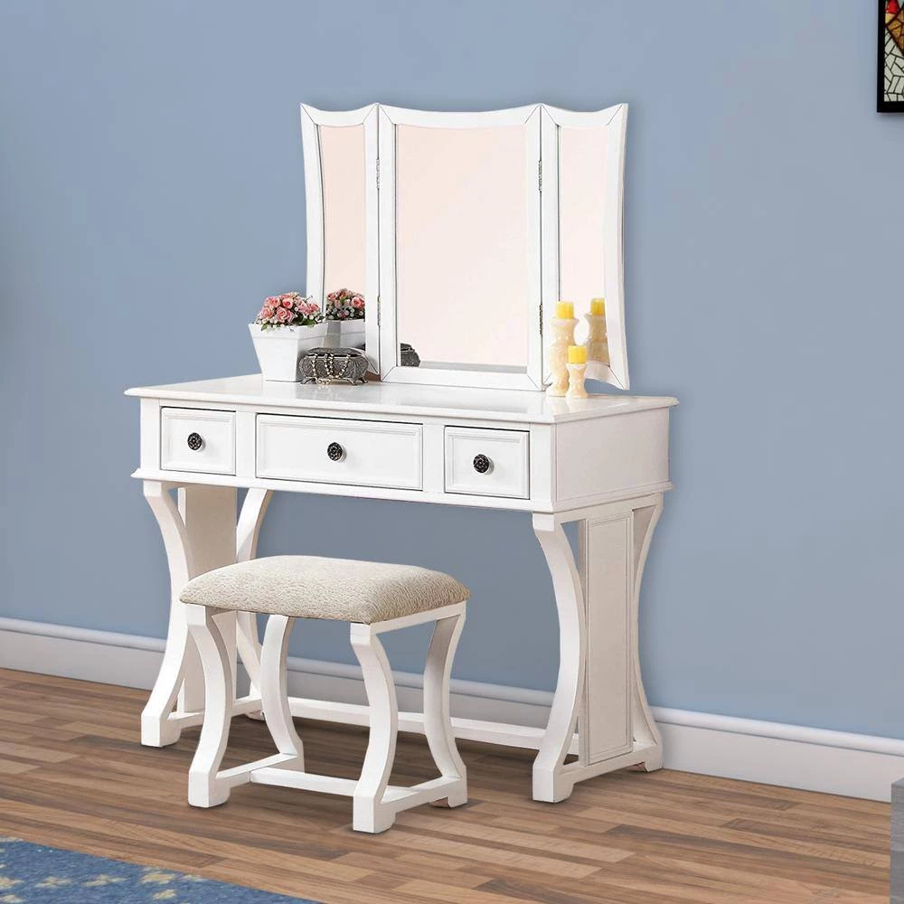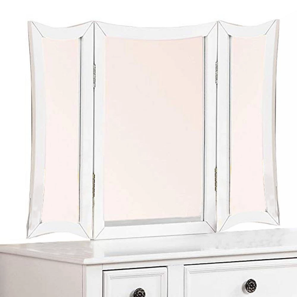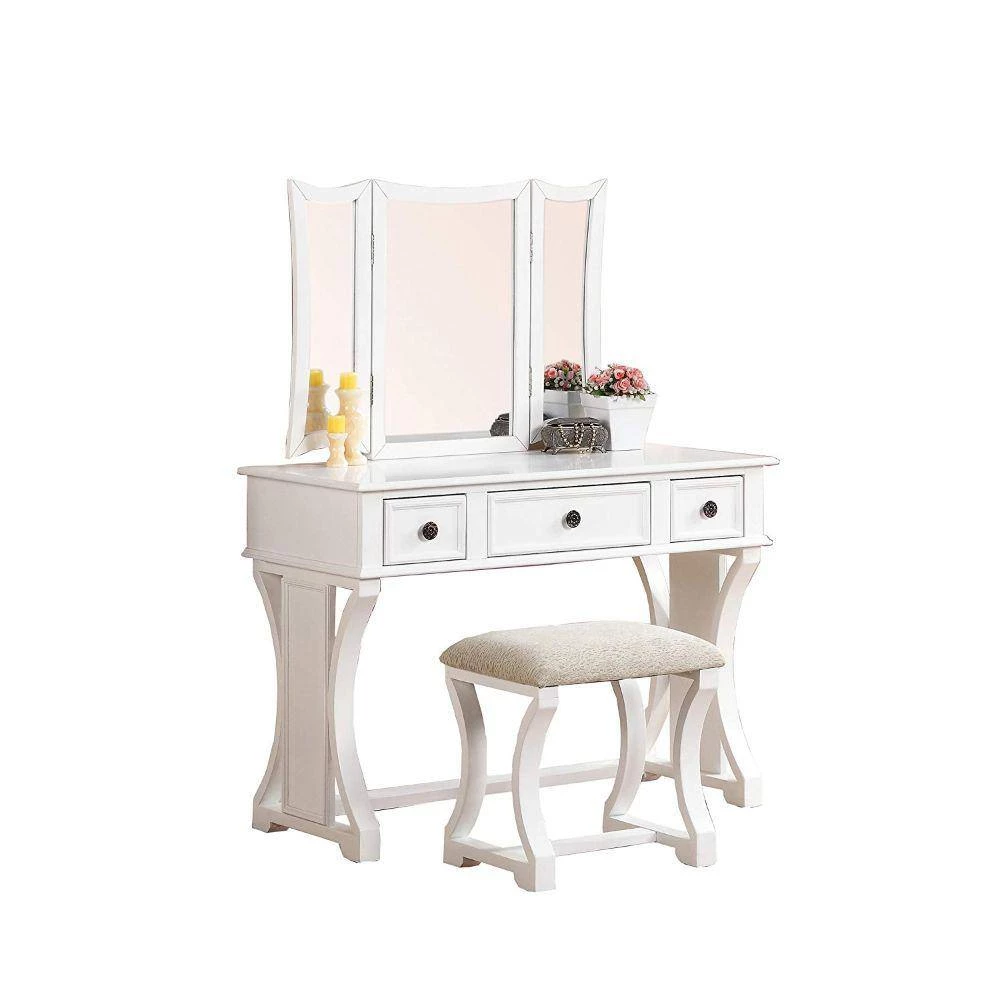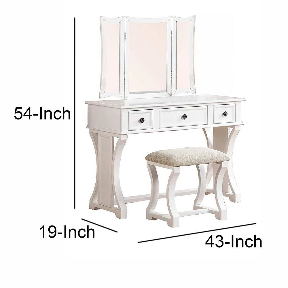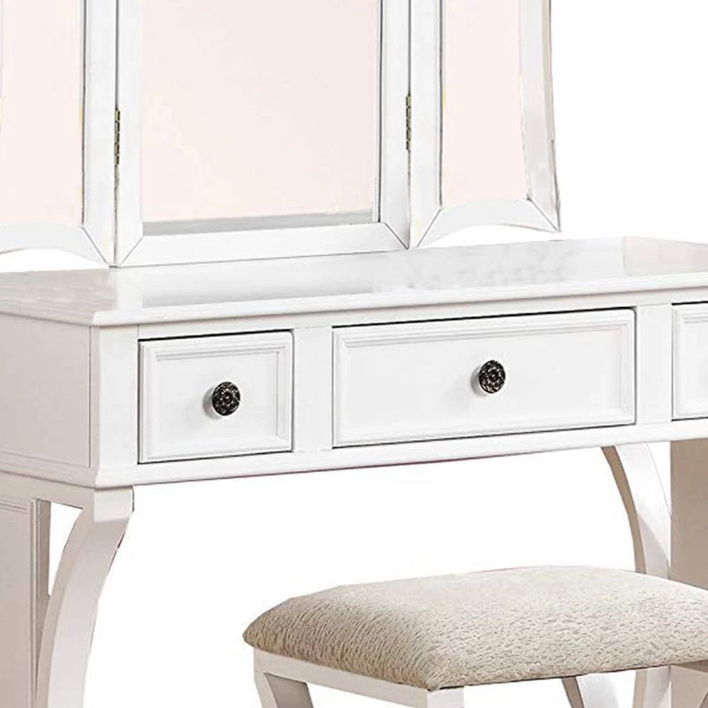 Adorn yourself in an elegant way, while doing makeup sitting in front of this vanity set. This wooden white finish vanity set comes in a funky design featuring 3 panel mirrors with movable extensions and 3 spacious storage drawer. This vanity set also includes one cushioned seat stool. Its functionality and beauty got enhance in manifolds with the stylish matching stool having padded fabric seat.