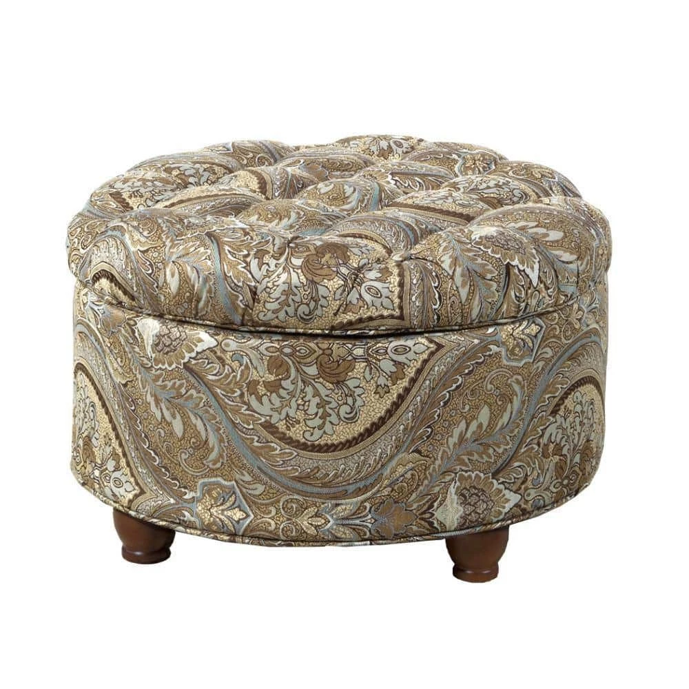 Bring this stylish and multipurpose, round shaped ottoman, to enhance your home in more than one way. With wooden frame, this multi hued paisley patterned fabric upholstered ottoman, has button tufted lift off lid, providing storage space to store linens, drapes, blankets extra pillows, controllers, magazines and other items. Use this ottoman as a coffee table; place it in your living room or bedroom as a storage space; pair it along with a recliner or chair, as a comfortable place to rest your foot after a long day at work or it can also be used as an additional seating.