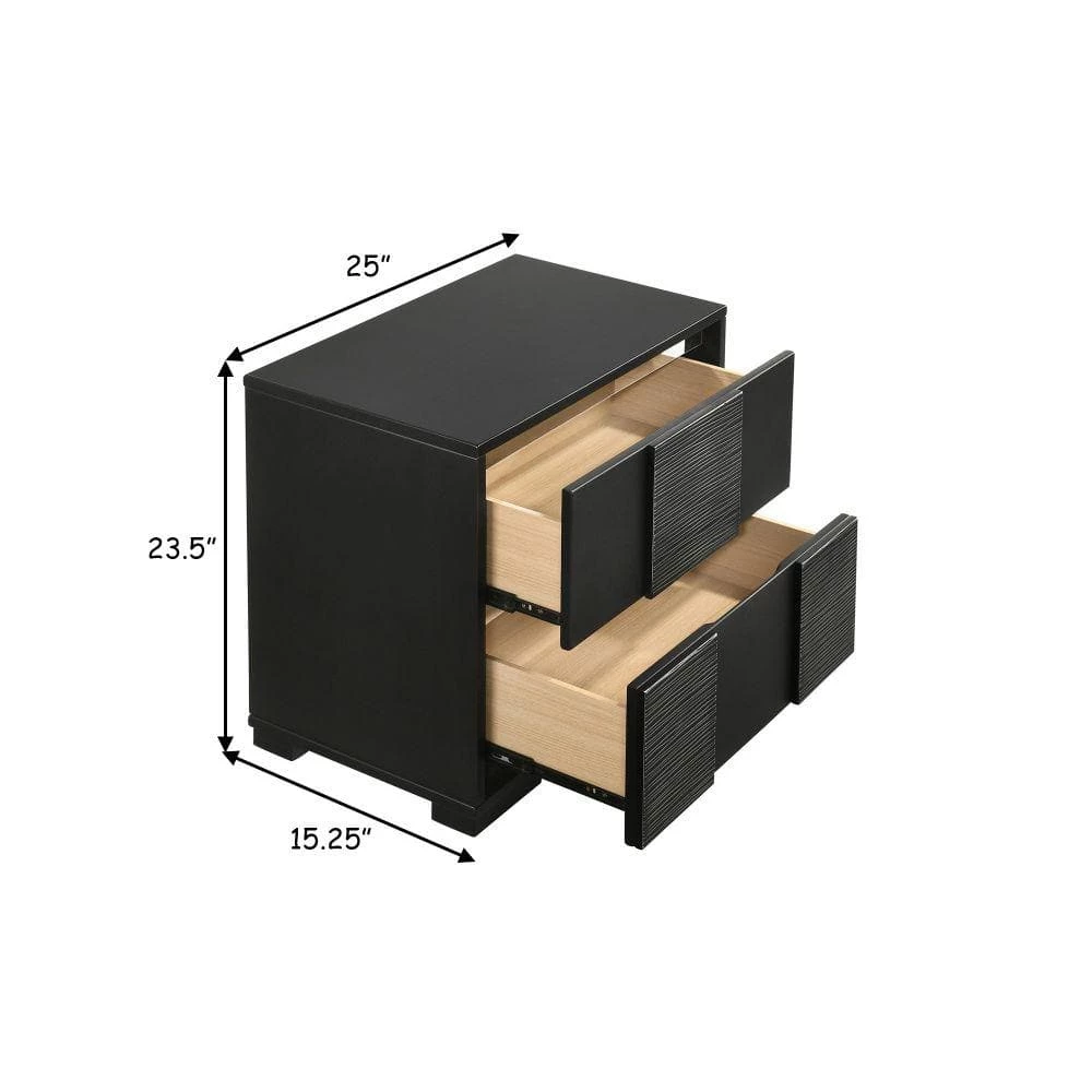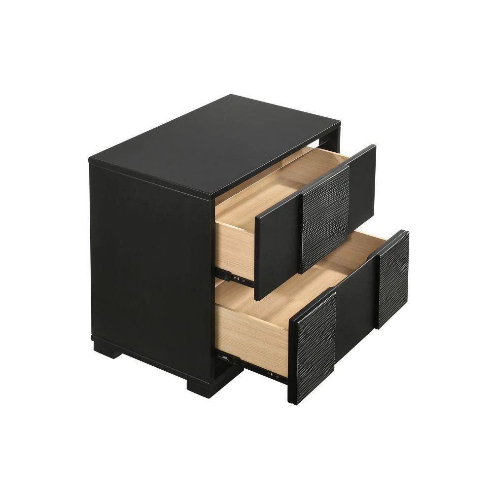 A unique addition to any bedside, this modern wood nightstand is made from high quality wood and completed with a smooth jet black finish. Equipped with whisper quiet gliding drawers, the top drawer comes lined in black felt, making it a perfect place for keeping jewelry and cherished possessions. Check out our Reza collection for matching items.