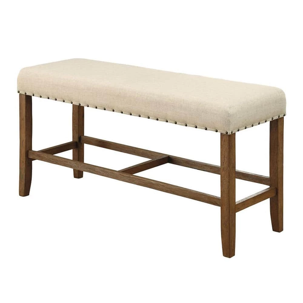 Add a touch of flare to your dining set, with this counter height bench for a unique combination of functionality and design. Constructed with solid wood, wood veneer and composites the bench comes in a natural tone finish. It features an ivory finish fabric upholstered seat adorned with nail head trim.