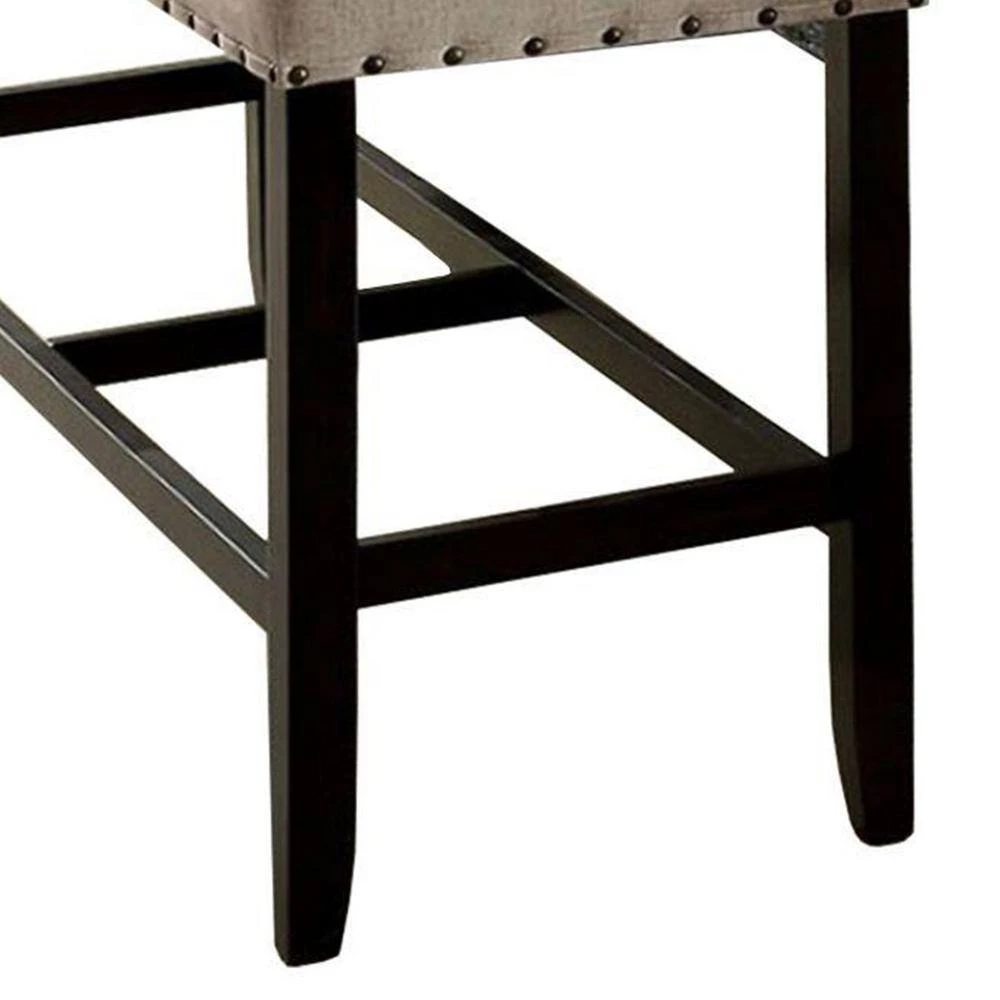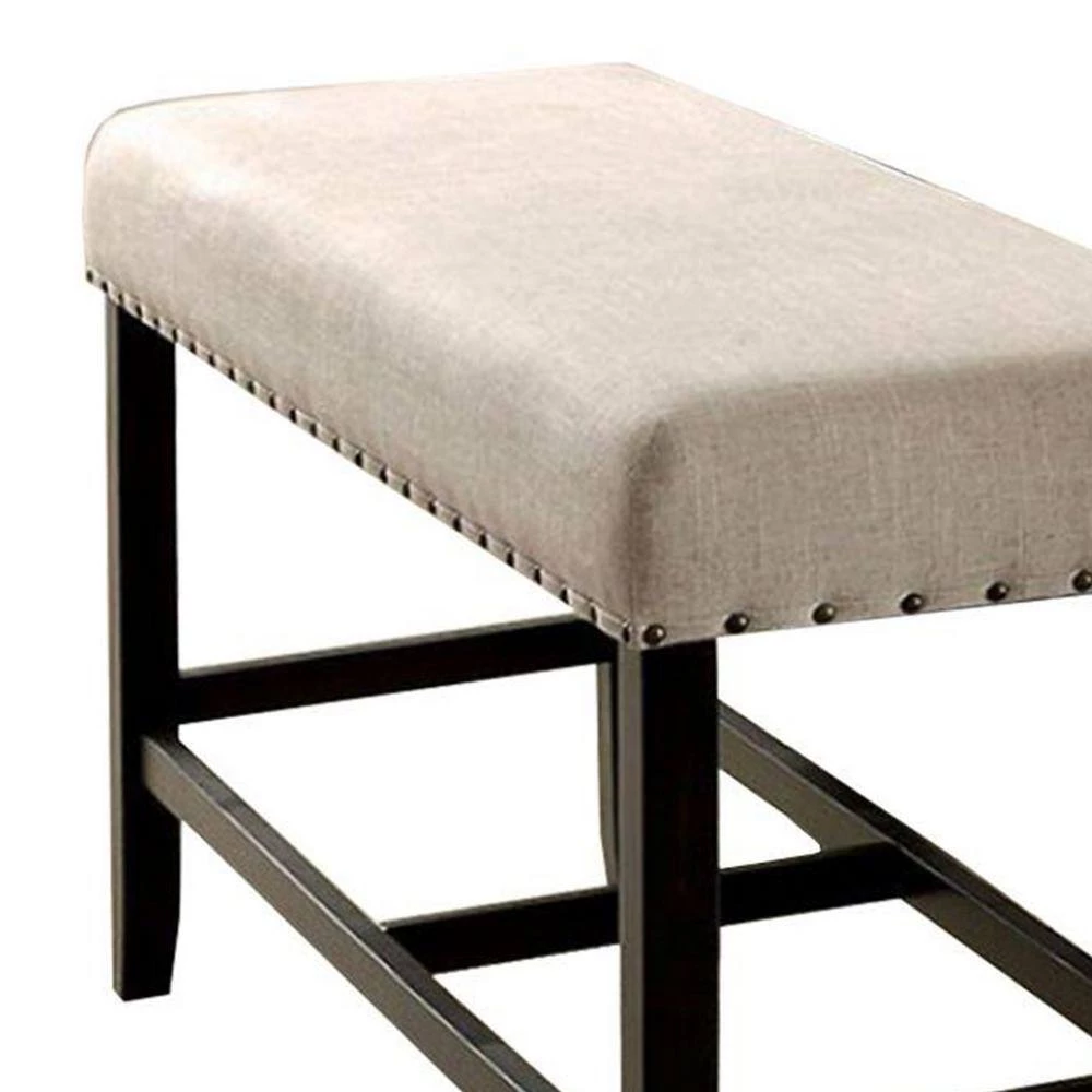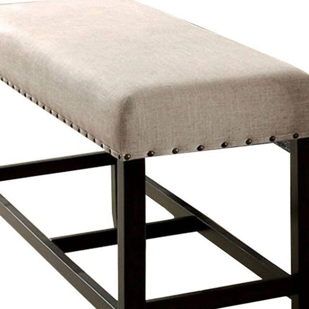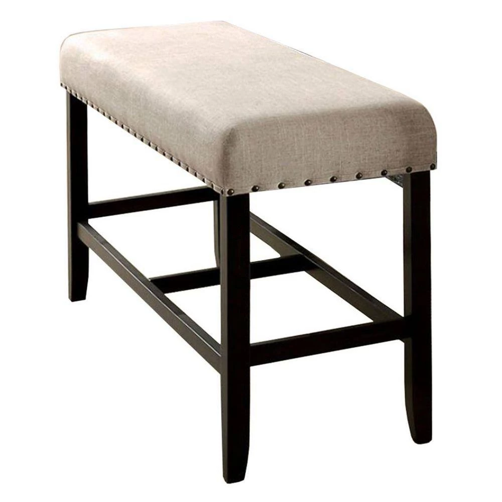 Rustic charm hits its peak with this stunning counter height bench. The rustic wood grain and distressed black finish take you to a charming farmhouse somewhere in the countryside, achieving an inviting, homey atmosphere that will have family and friends coming back for more. Ivory linen-like upholstery adds a brightening effect while the seat is adorned with nailhead trim.