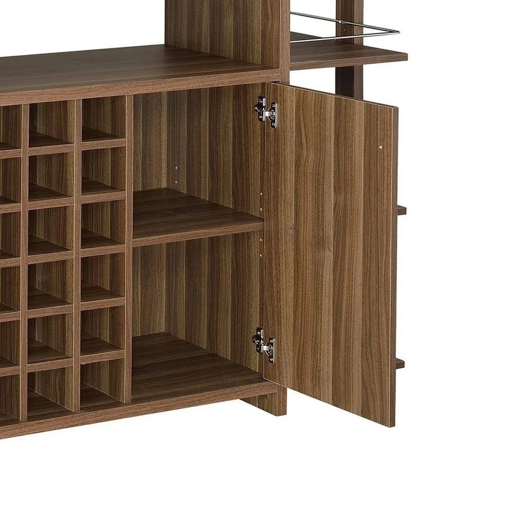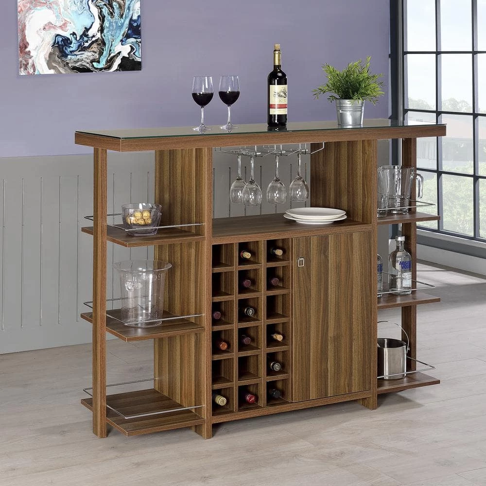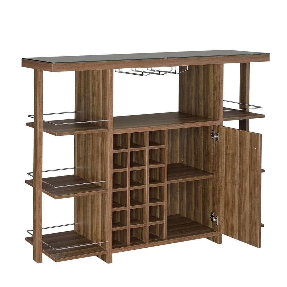 This modern bar is perfect for a wine connoisseur with built in storage space for wine bottle and wine glasses. The bar has simple and clean design with a glass top and a walnut (Brown) finish. Besides the wine and wine bottle storage, three shelves on each side and a door provide plenty of storage space for drinking accessories.