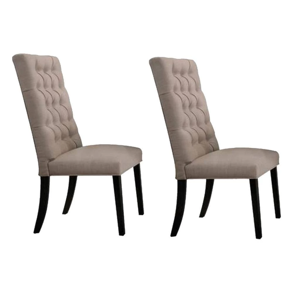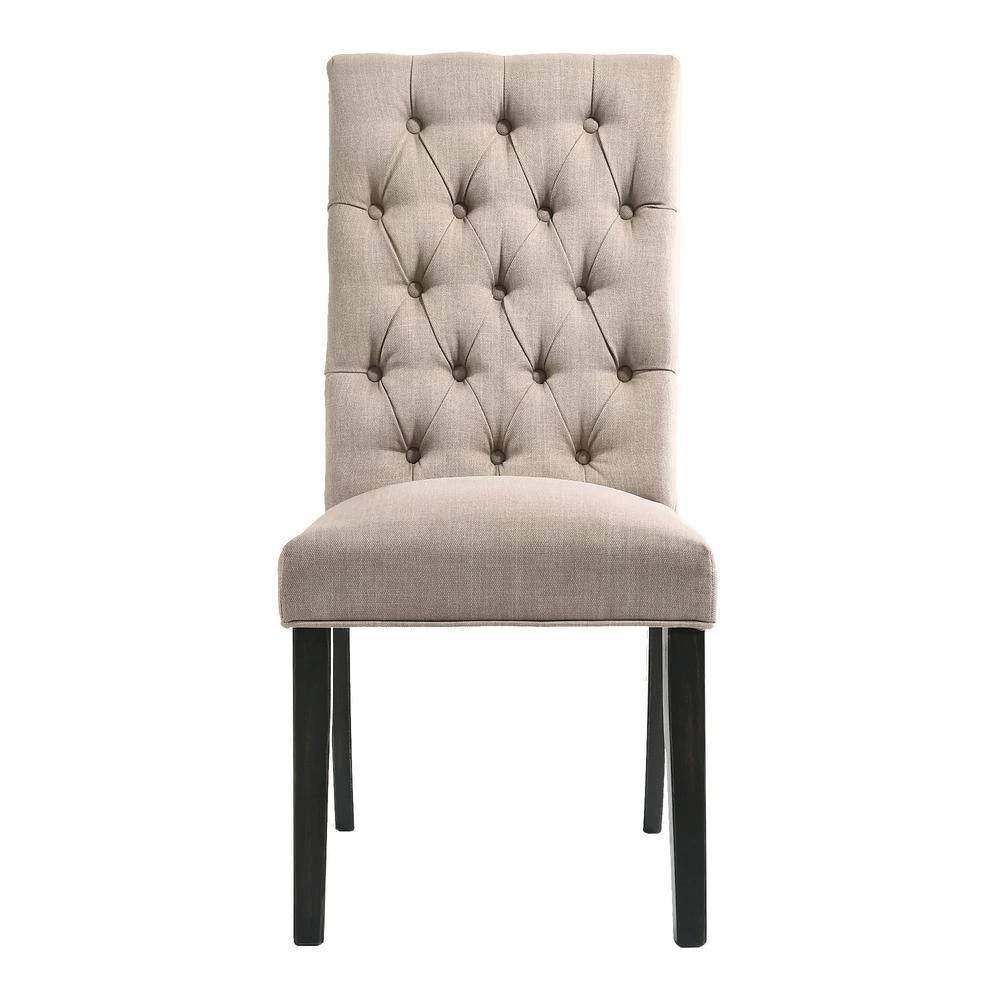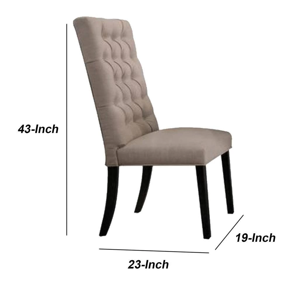Bring a contemporary feel into your dining room with the addition of this fabric upholstered Set of Two Dining Side Chairs. The curved back with button tufting details add a classic design touch to these chairs, while a comfortable cushioned seat construction makes for a comfortable meal with family and friends. Slightly tapered legs in the front and flared legs at the back in a vintage black wood finish complete this sophisticated set of chairs. Create a sophisticated style for your dining room decor with the inviting feel of these dining side chairs.