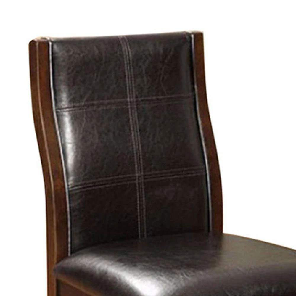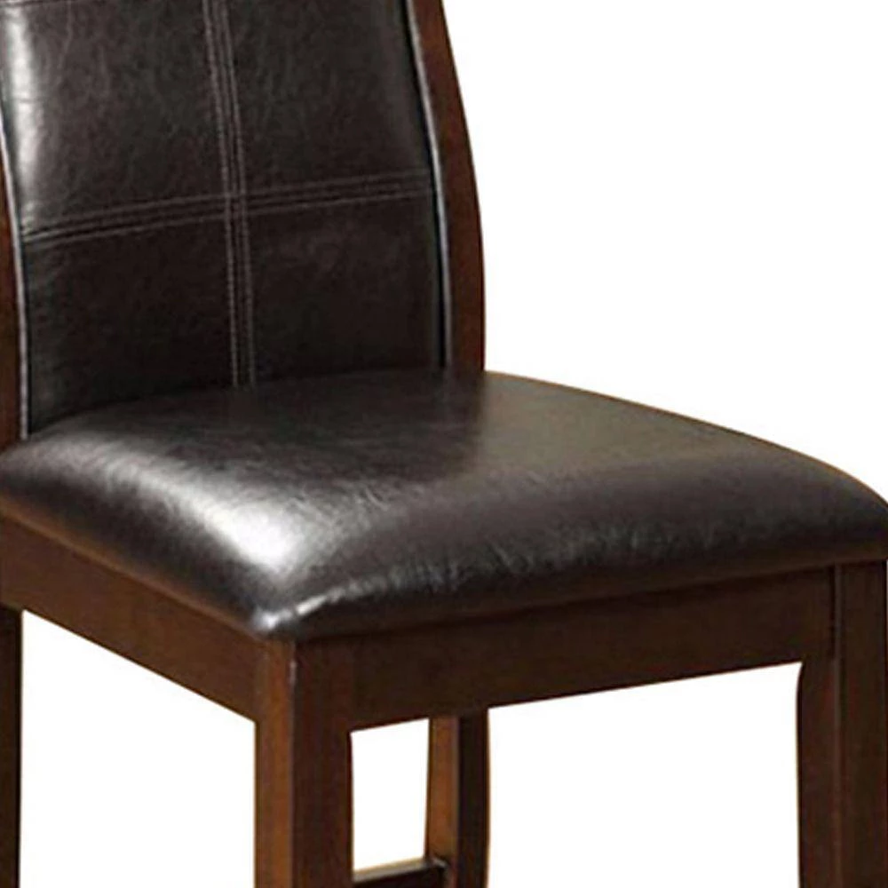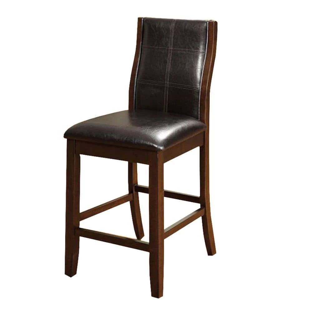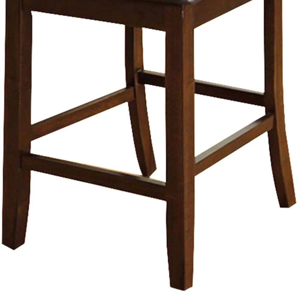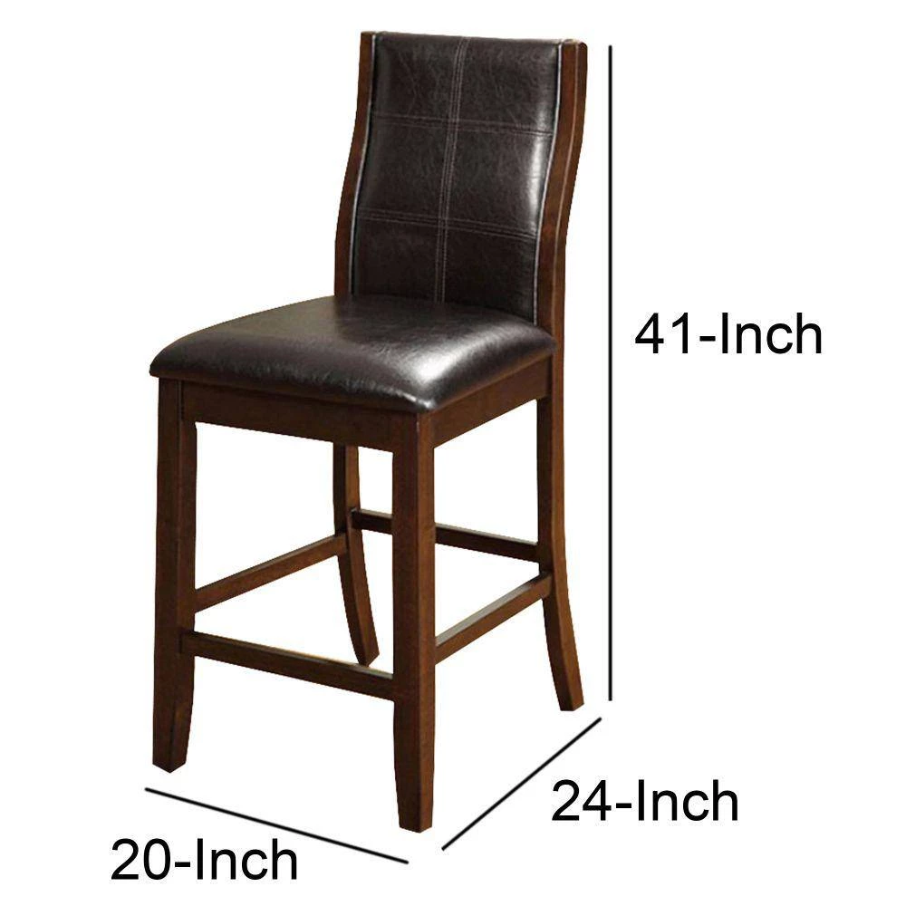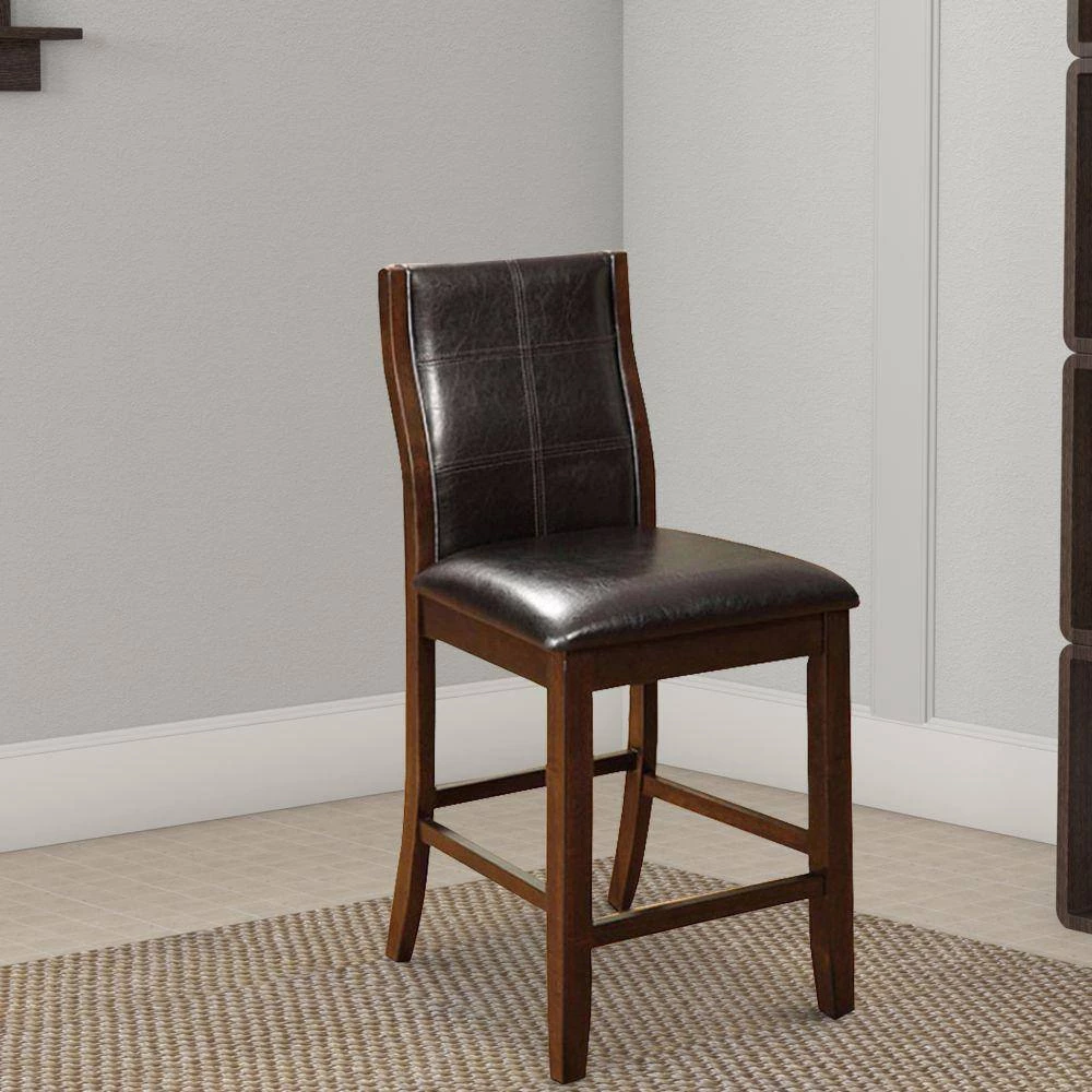 This counter height chair has padded leatherette chair with slightly curved backs. The transitional look chair is finished in cherry brown. It will provide great seating and enhance the beauty of your space.