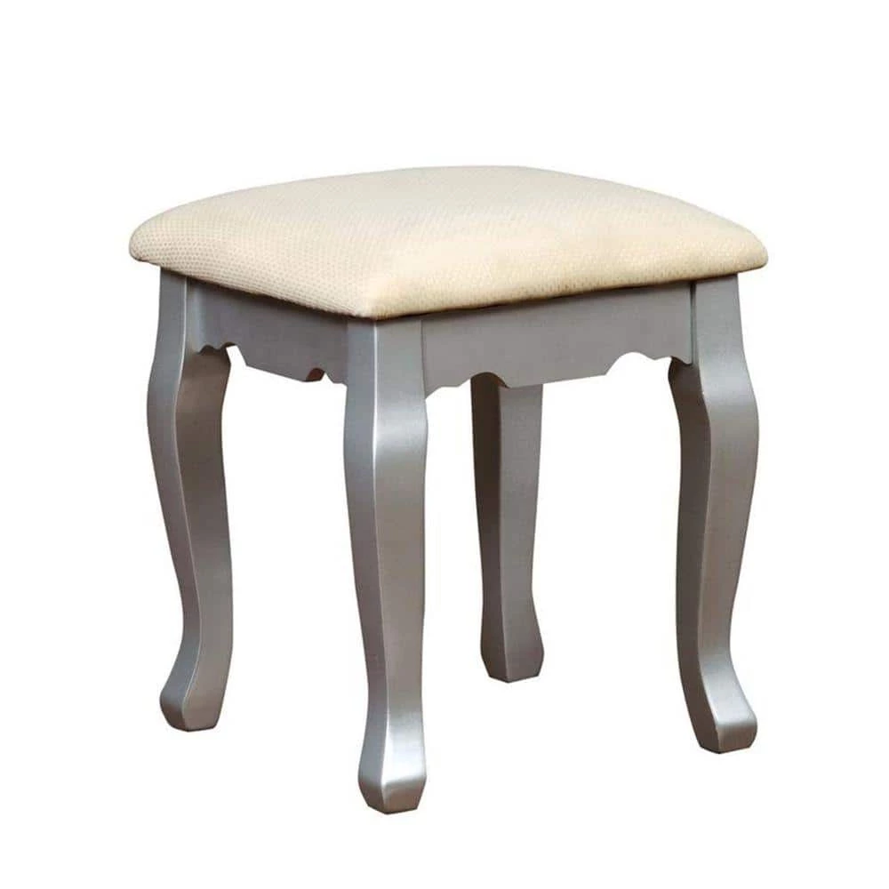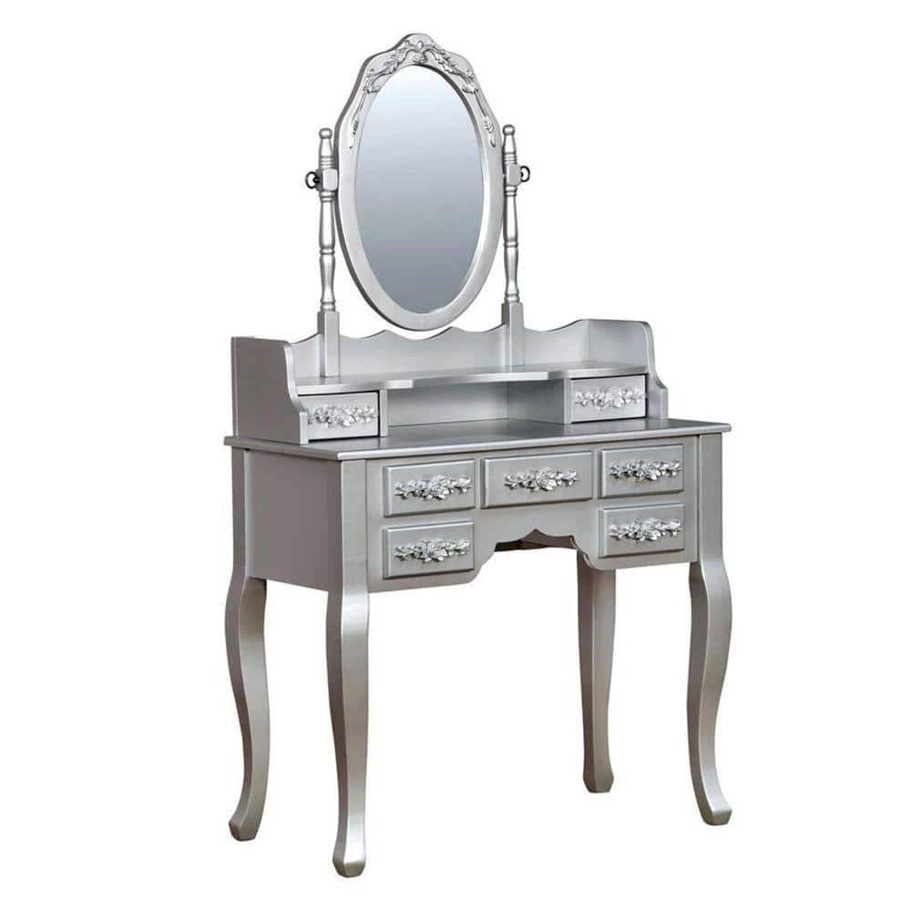 This transitional vanity table proudly displays gently curved legs that help draw attention to the carved details on the drawer panels. Spread out your makeup and beauty products across the two shelves or in the multiple drawers so everything is in one place. It enhances the beauty of the room.