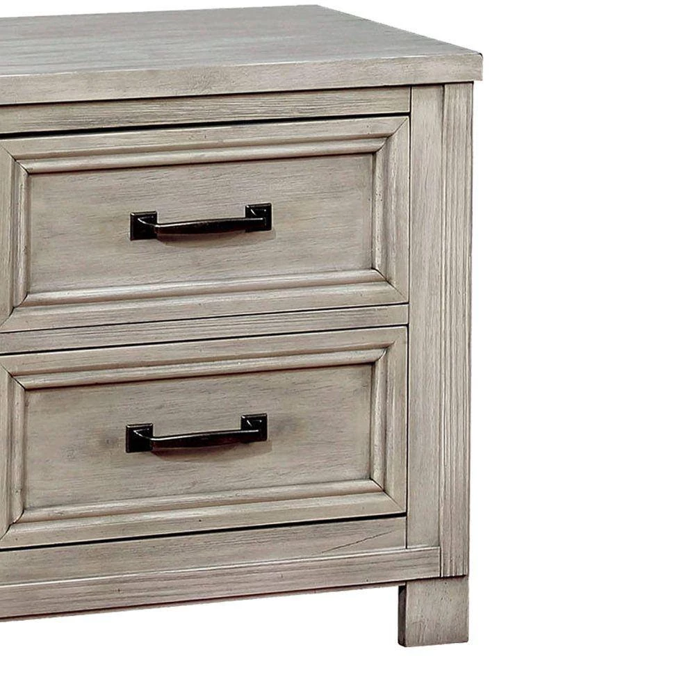 Enhance the aesthetics of your bedroom with this transitional nightstand. Constructed with a combination of solid wood and wood veneer, it features 2 spacious-drawers accented with antique metal pulls for easy access, providing ample storage option. Molded trim details blend in perfectly with the wood adding to the overall design of the nightstand. Available in antique white finish, it will be a perfect addition to your bedroom.