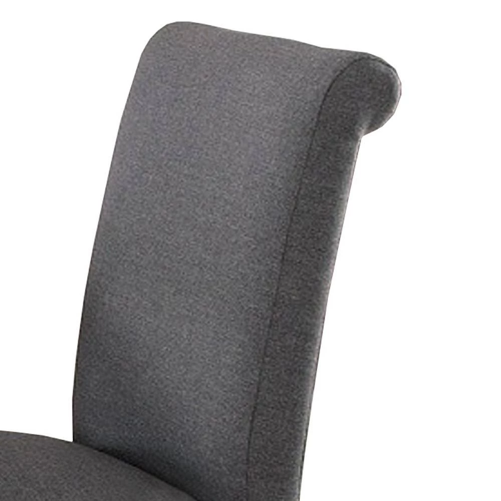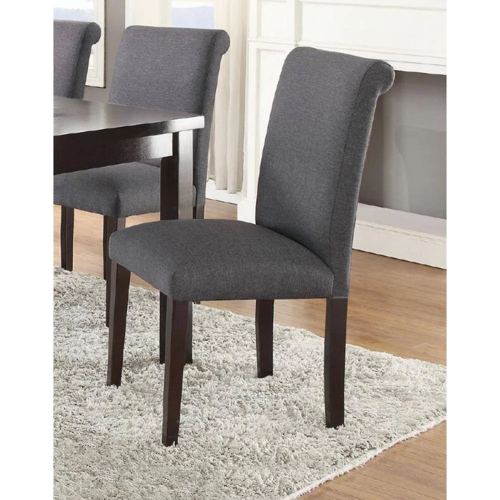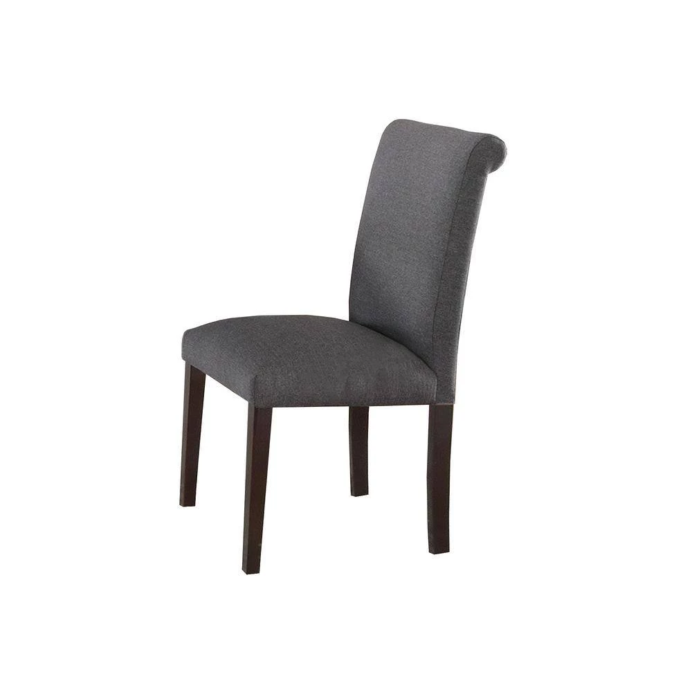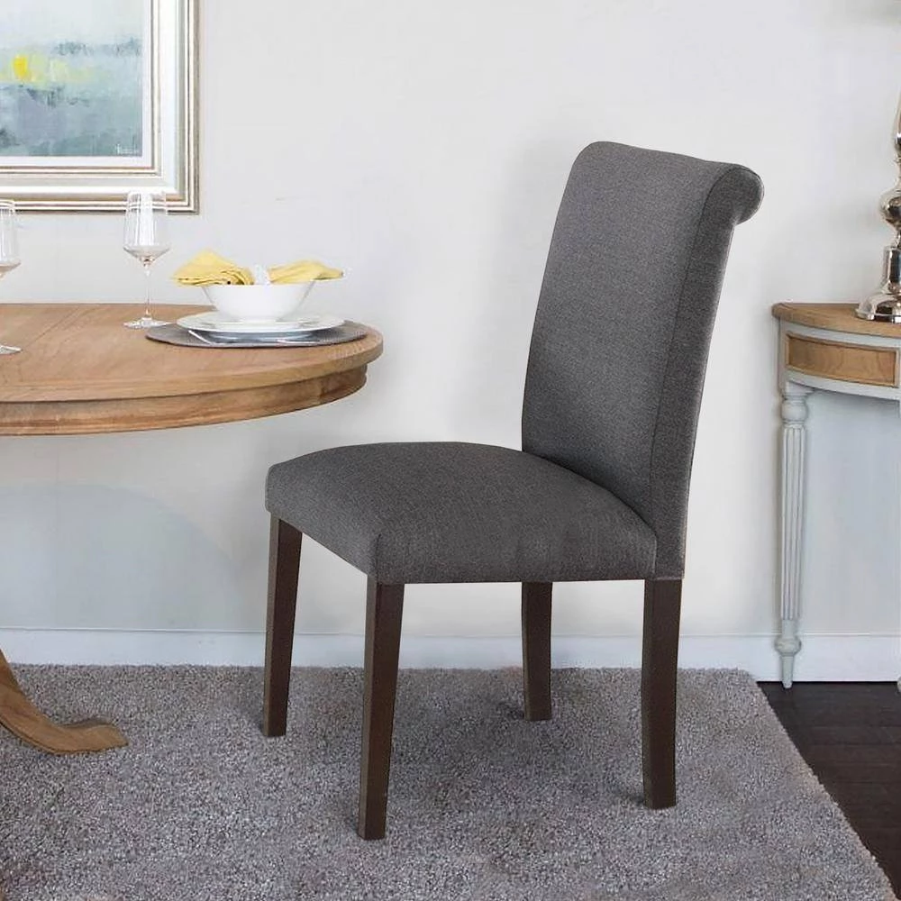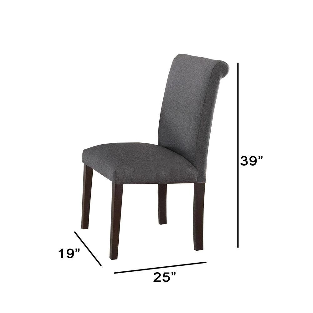 Appreciate the sleek, modern design in comfort of this set of 2 dining chairs. A high back provides full support for your spine and shoulders, allowing you to relax easily. Gentle padding under the soft and smooth upholstery provides a soft cushion, ensuring a superior comfort to your back. Coordinating blue grey upholstery and solid wood base, this set of chairs emits sophistication and class to your dining room.