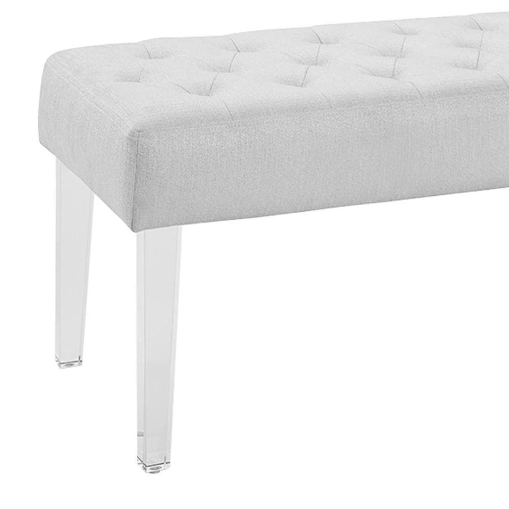 Update your home decor with added function and style with the inclusion of this transitional leg bench. Constructed using foam and upholstered in polyester, it features rectangular seat with tufting details for a comfortable seating experience. Supported on clear acrylic legs for a durable support, this leg bench adds a sophisticated look to your entry way or living room.
